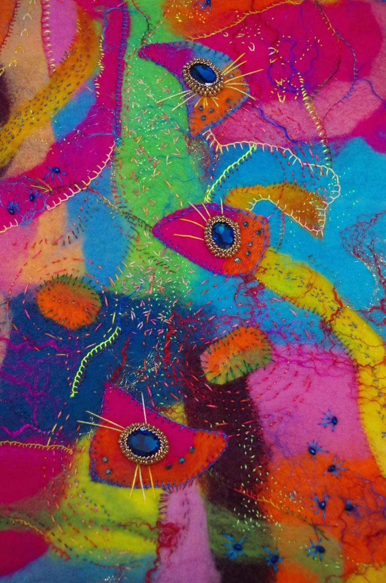 Free-motion embroidery will then be implemented to define shape edges, accent textures and emboss thick felt.