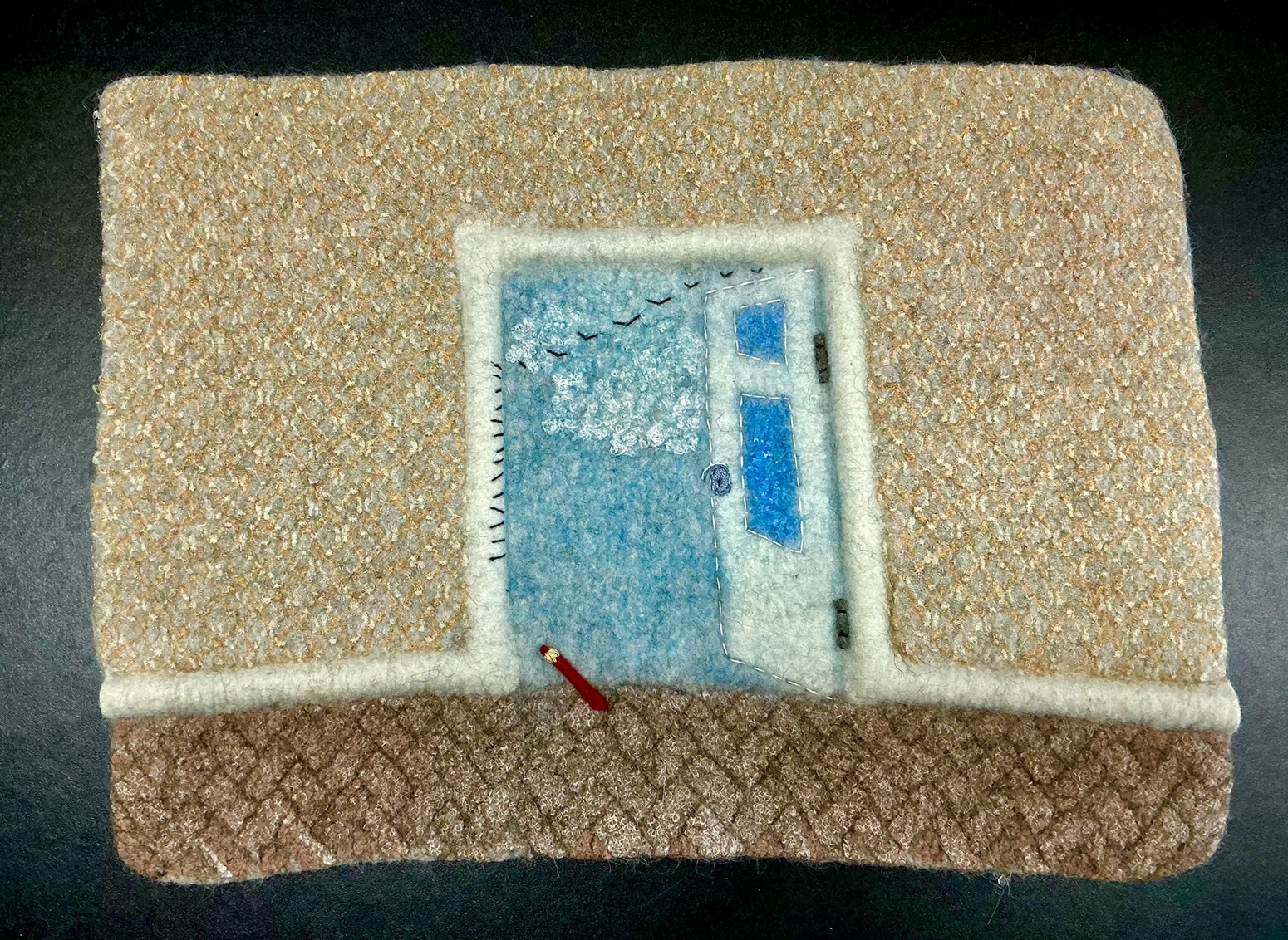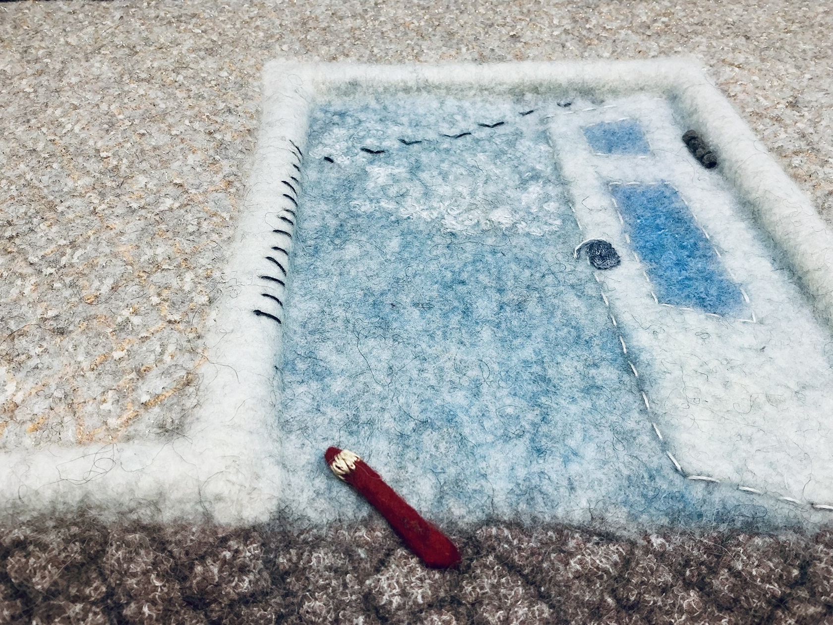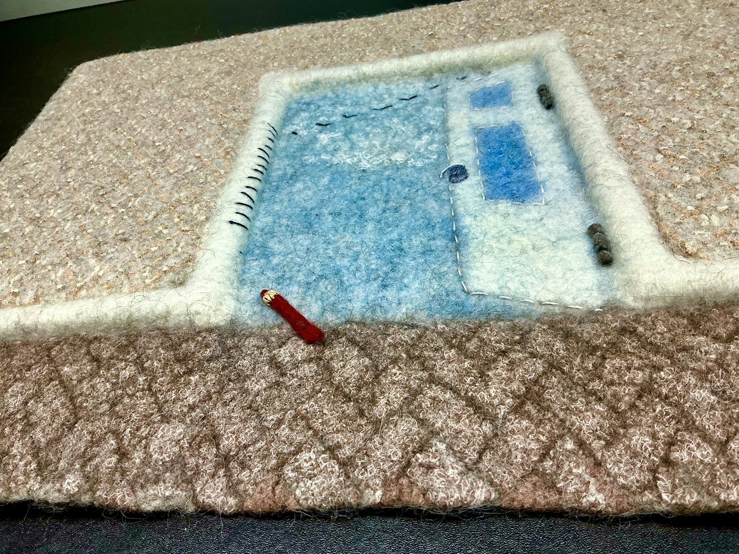 Materials and Techniques: Corriedale wool fibers, merino wool fibers, polyester fabric.