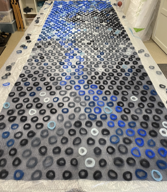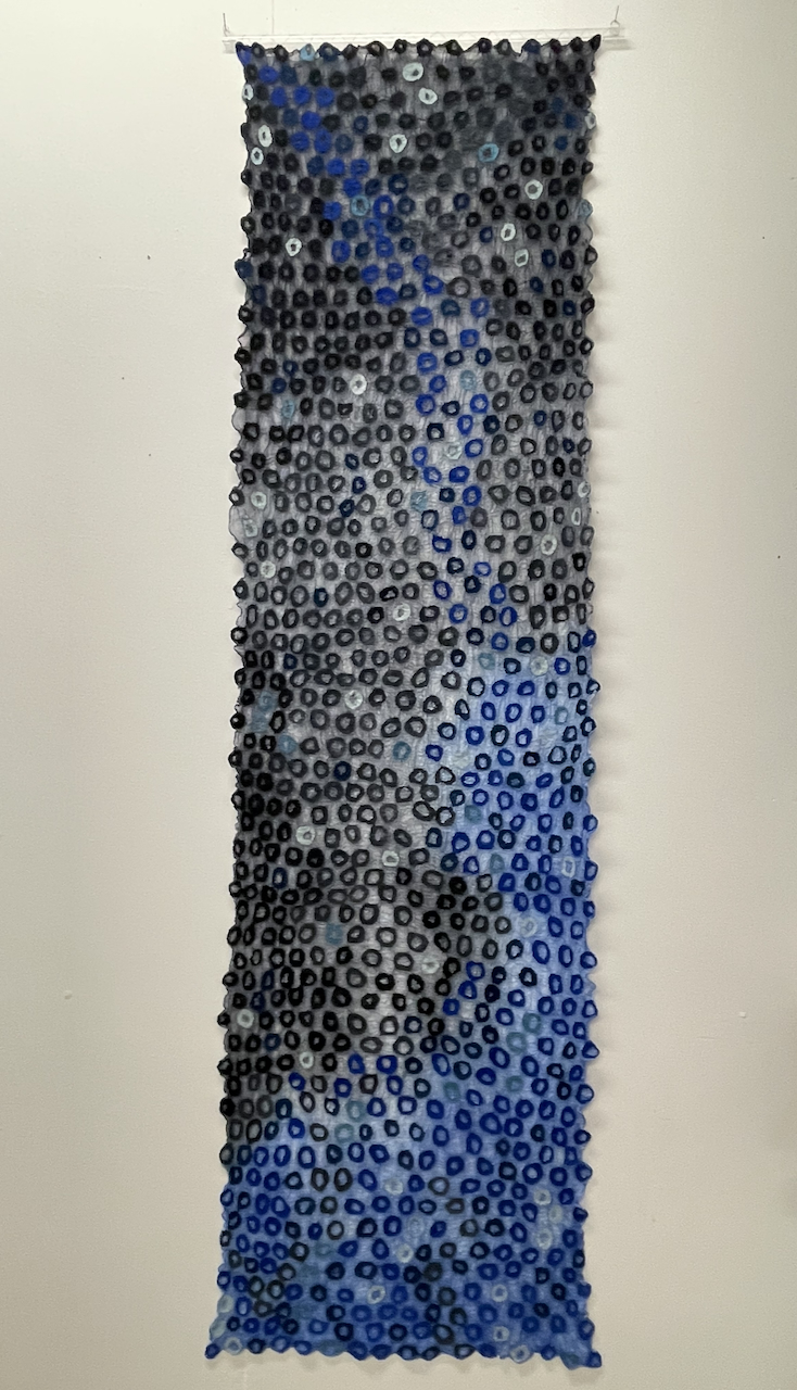 Inspiration: Dedicated time was essential to complete the work “Skagerak”, made with approximately 930 individually made circles on a hand dyed silk backing. The whole process required patience and time - dyeing the materials, making and moving the circles around, and finally the very careful felting process to make sure everything stayed in place.