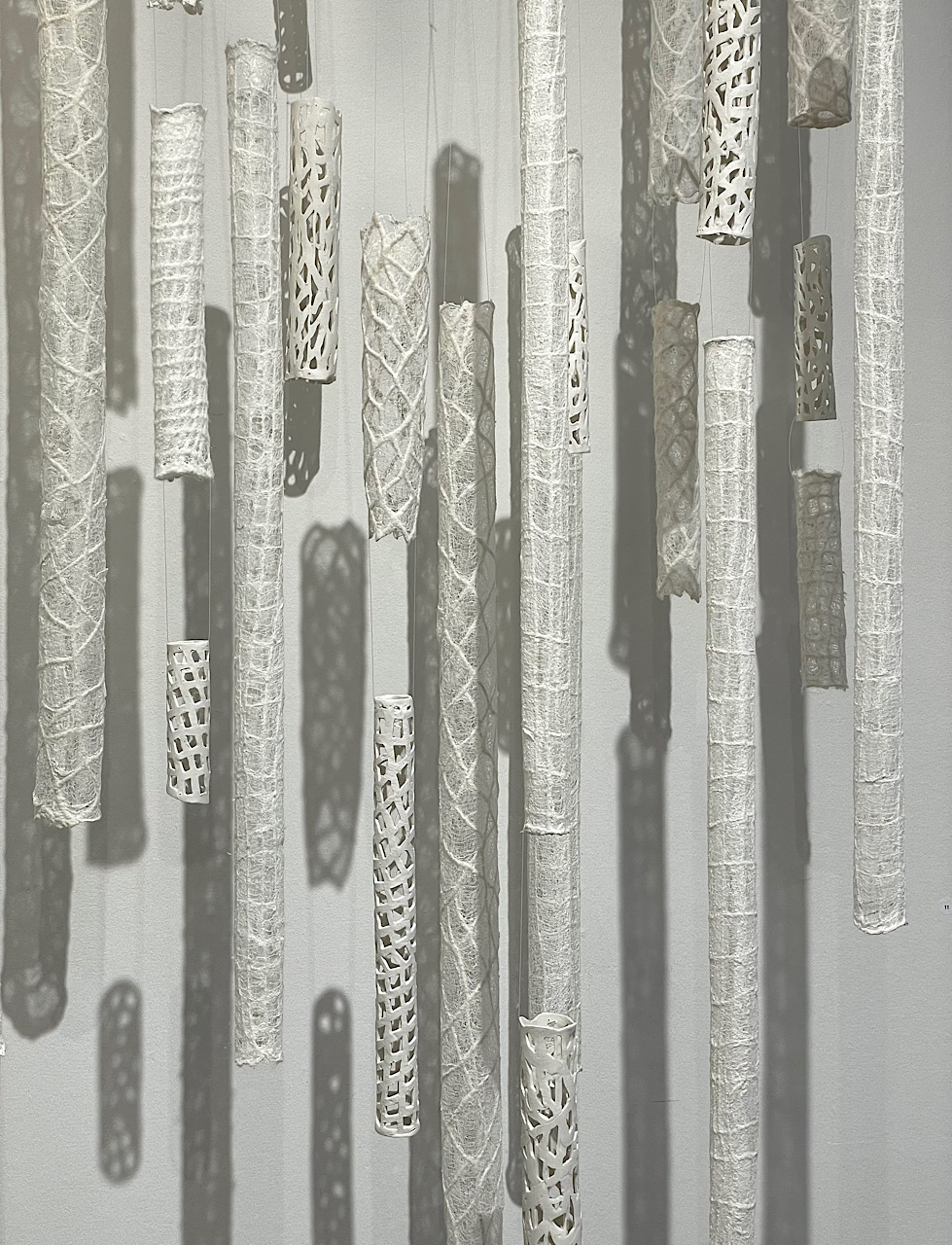 Materials and Techniques: Merino wool/wool yarn, Margilan silk, cotton scrim and porcelain (porcelain elements by Ruth Sissel Foss)