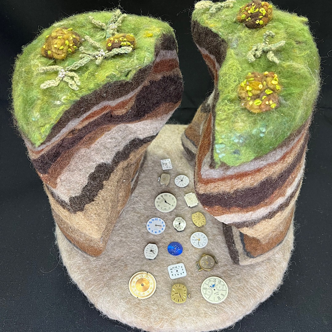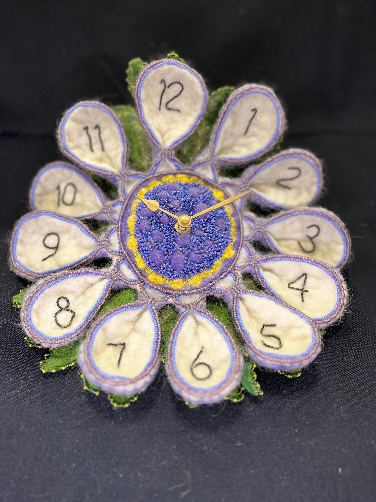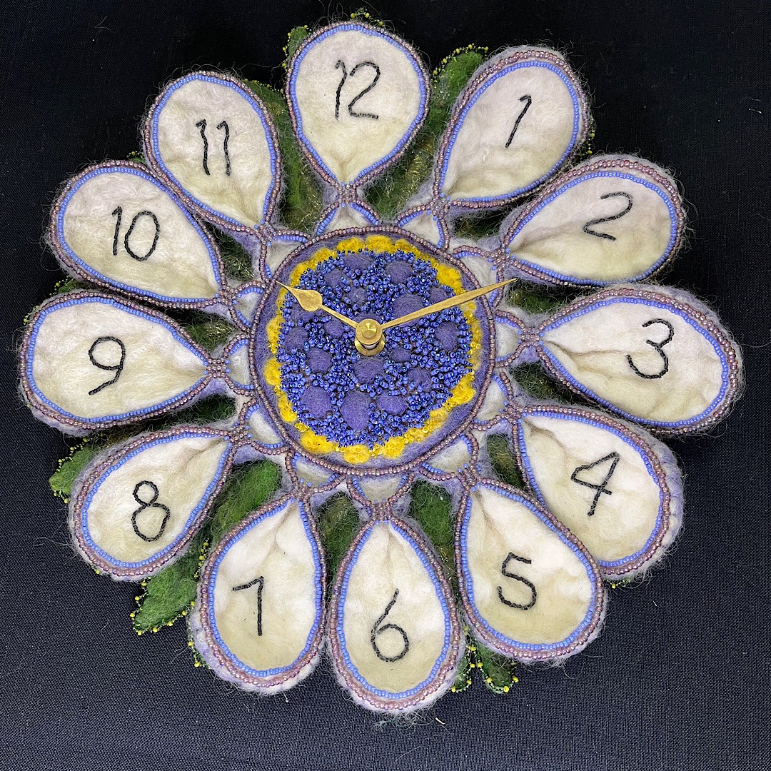 Materials and Techniques:  Merino wool, beads, clock mechanism
