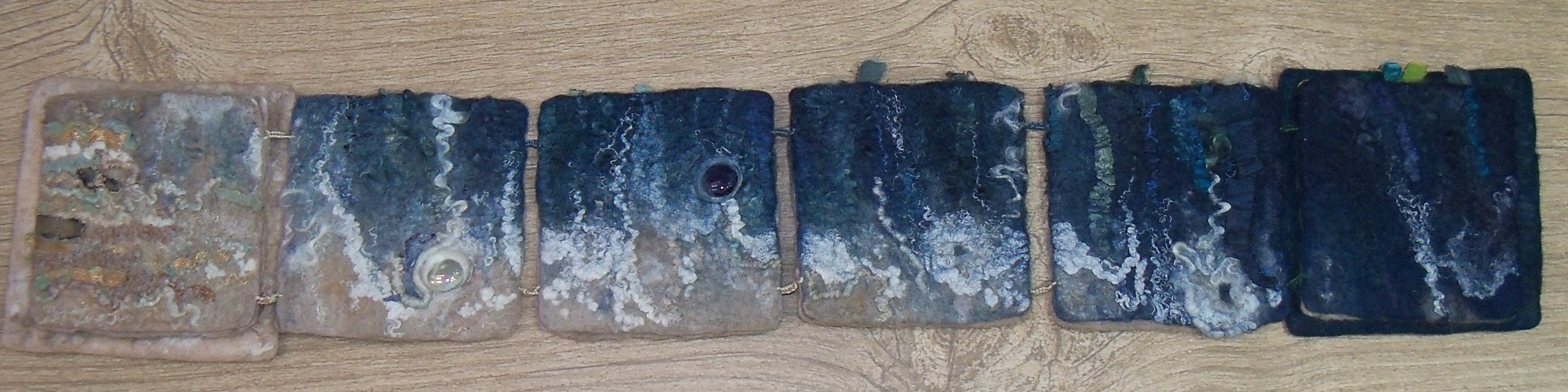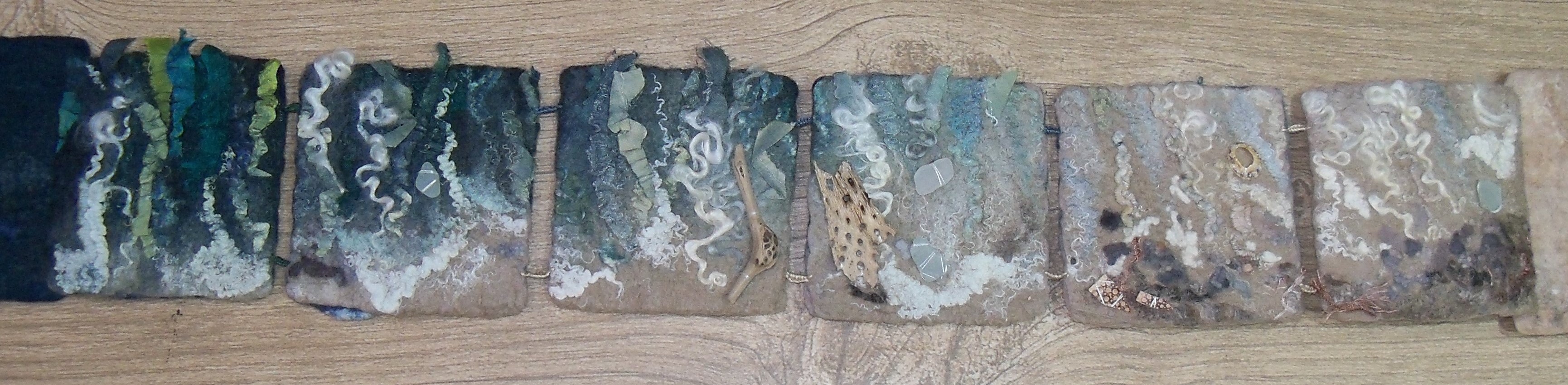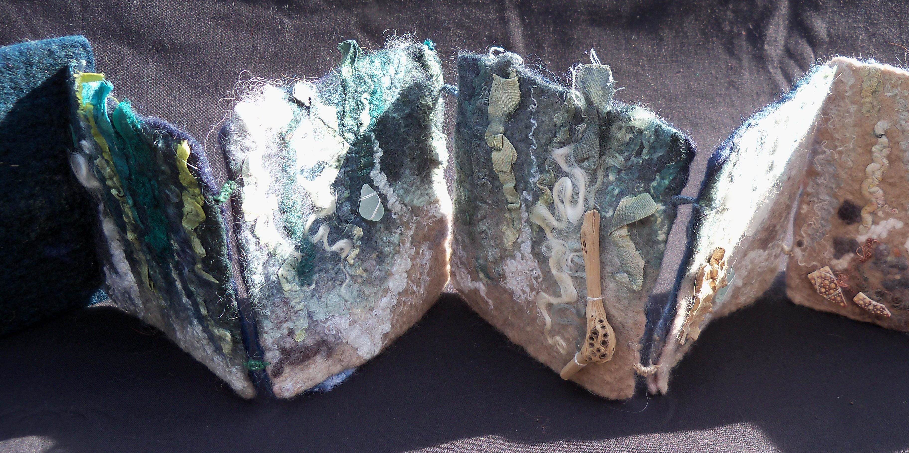 Inspiration:"Time and Tide wait for no man": This is a reversible concertina book formed of felted tiles showing the tide ebbing away on one side and flowing in on the other- a continuous cycle.