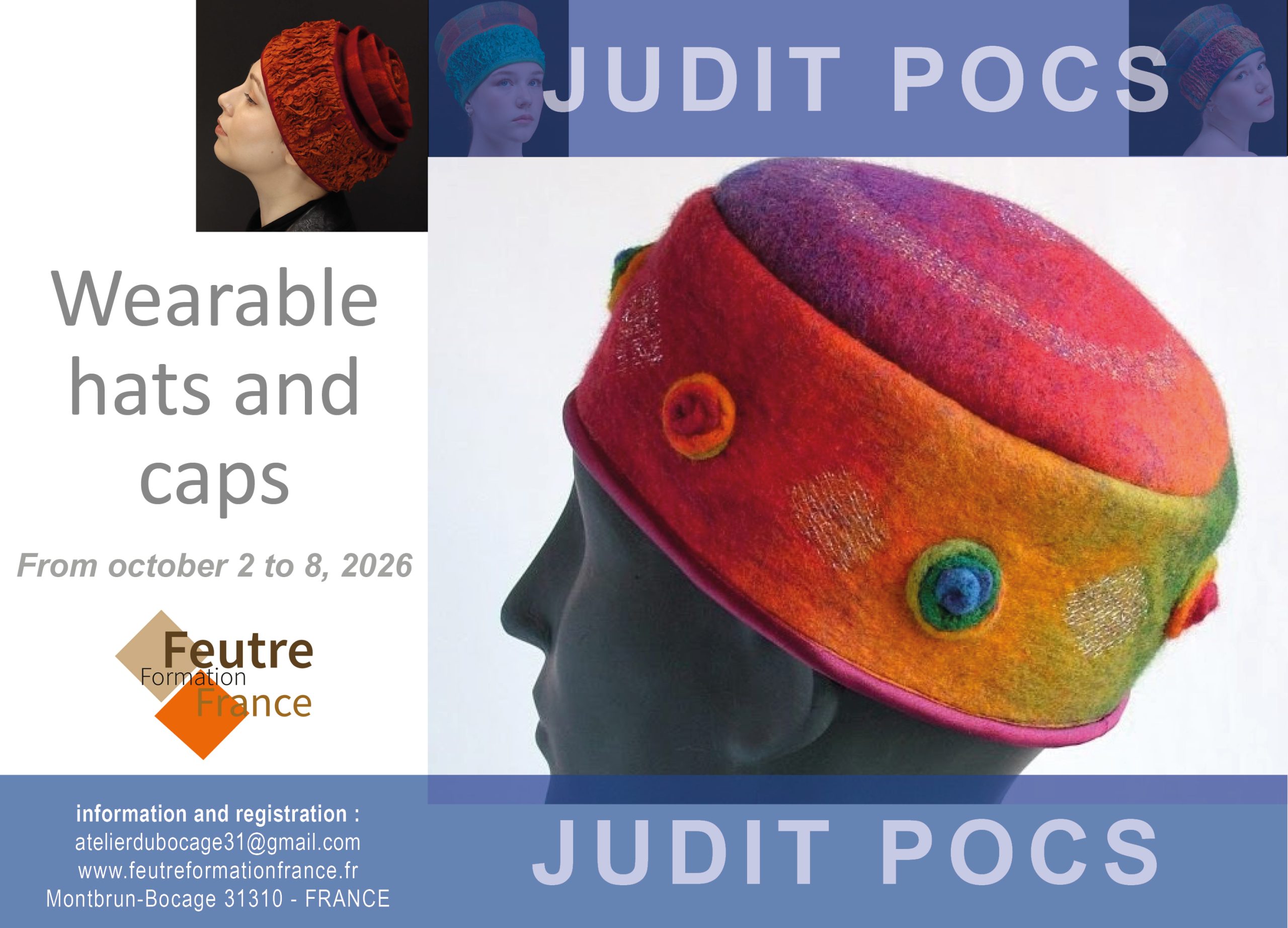 This course invites participants to explore the creation of different hat forms — folded ornamental hats, flat caps, bohemian caps, hoods, and hats embellished with pleated silk — while experimenting with the qualities and behavior of local wools in 3D felting.