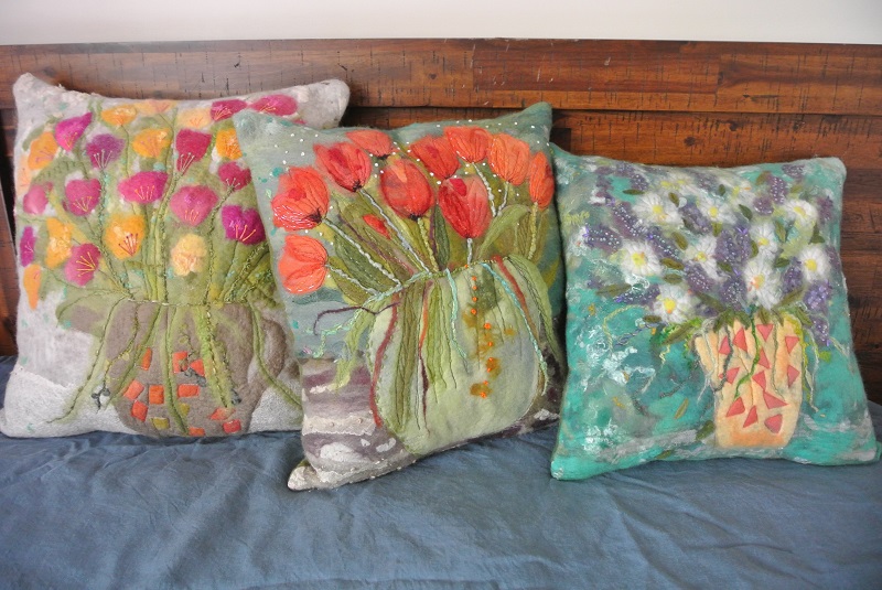 My work is not planned to a set design, but rather, my pieces evolve as I combine, colour, texture, fibre, stitches and embellishments. I especially like making nuno felt- wool on fine silk or muslin fabric.