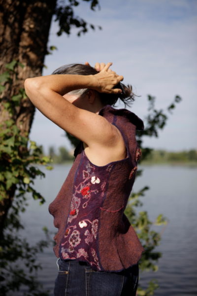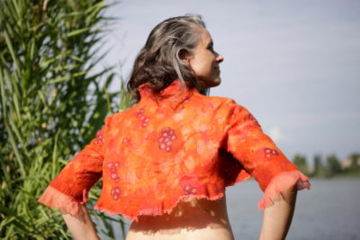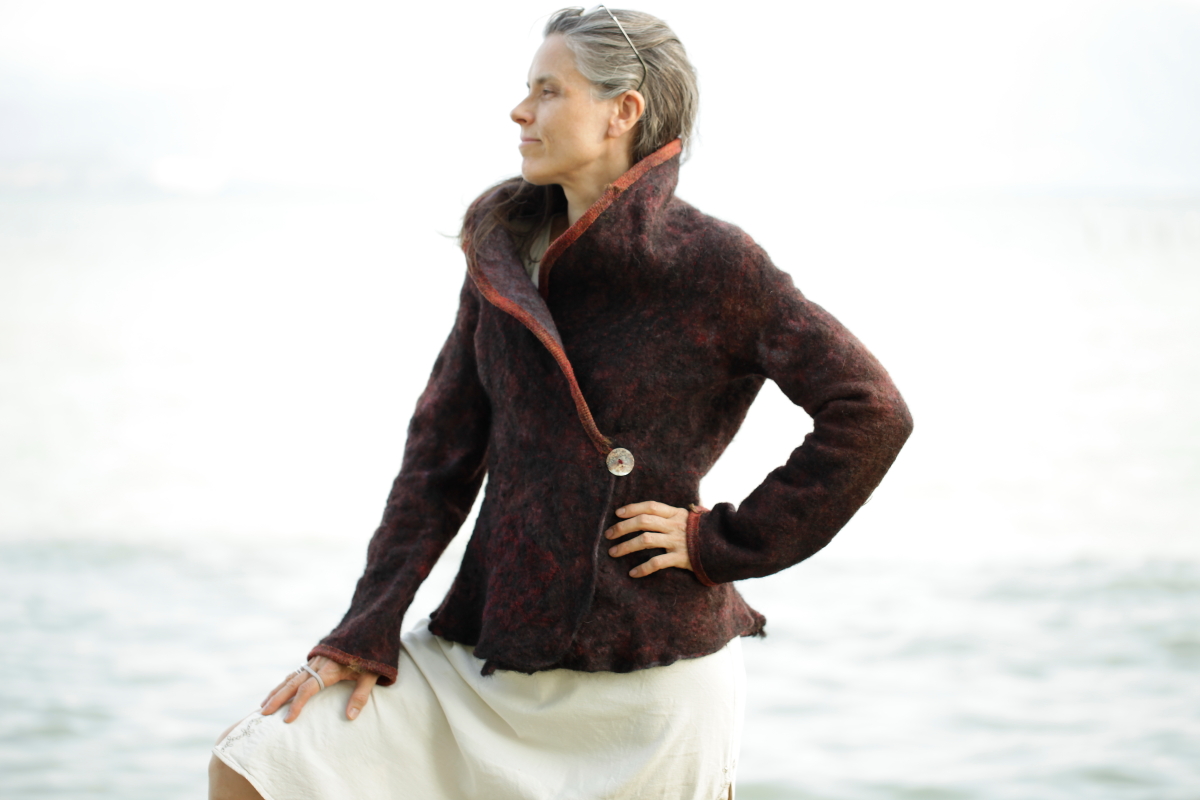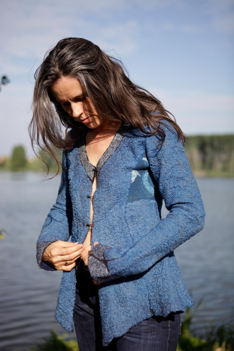 a jump in time I moved back to Denmark for some years and came back to Italy to settle down by the Lake Garda where I live with husband and family and a studio at home, working freelance with custom orders and teaching. In 2006 I discovered nuno-felting. That was the beginning of a new adventure. I was completely mesmerized by the infinity of possibilities in creating various textures, blending colors, mixing materials… So a part of my journey has been to create a fusion between my passion for pattern making and the versatility of the felt, expanding the horizons.
