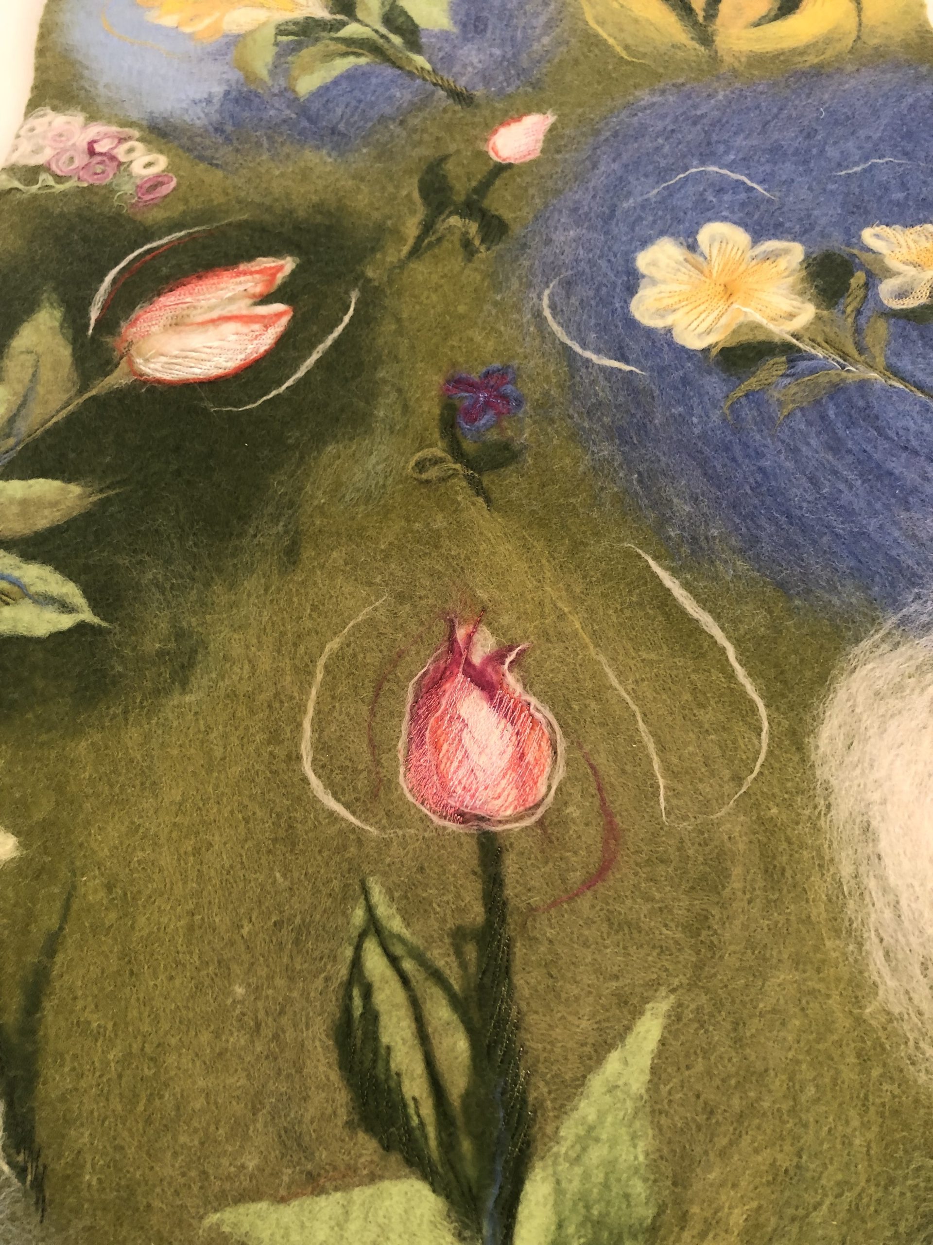 I work to exhibition and for commissions out of my studio in Ledbury Herefordshire at the moment and have recently taken part in open studios here ... I really enjoy trying to recreate/ draw natural and domestic imagery out of fleeces as it's pretty challenging at times, also hand rolling wet felting appeals much more to me as I love the alchemy of it all..... Usually I embellish with machine embroidery in order to create a three-dimensional effect within the wall hangings or framed works.