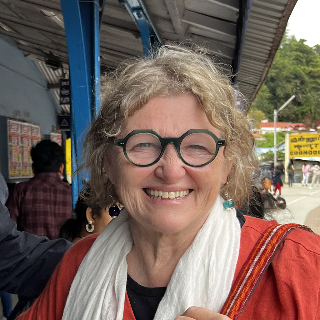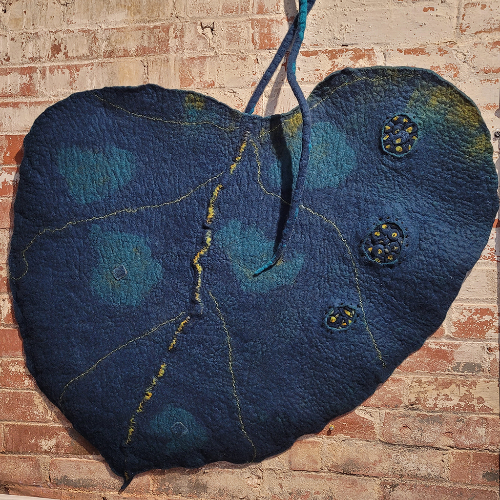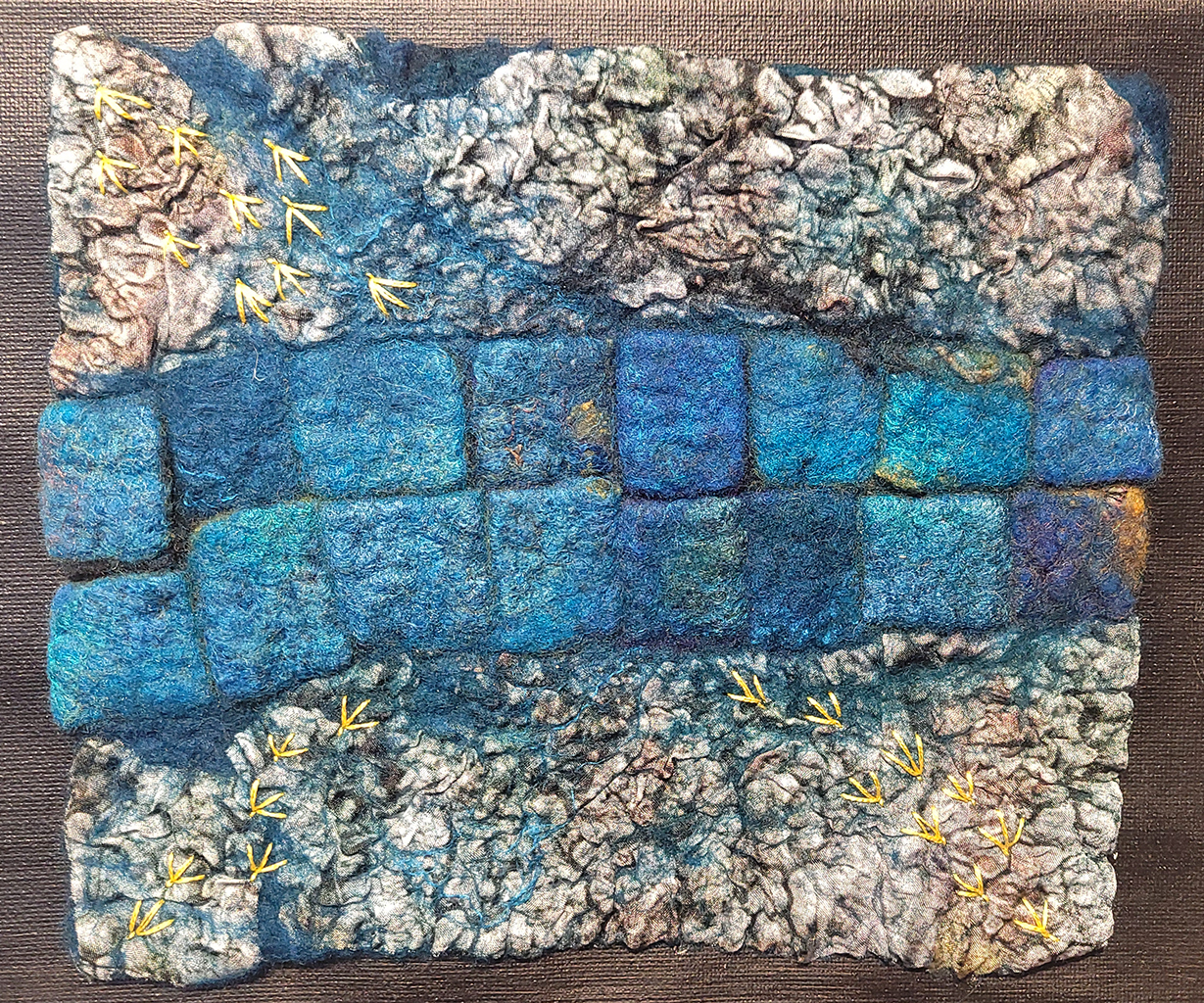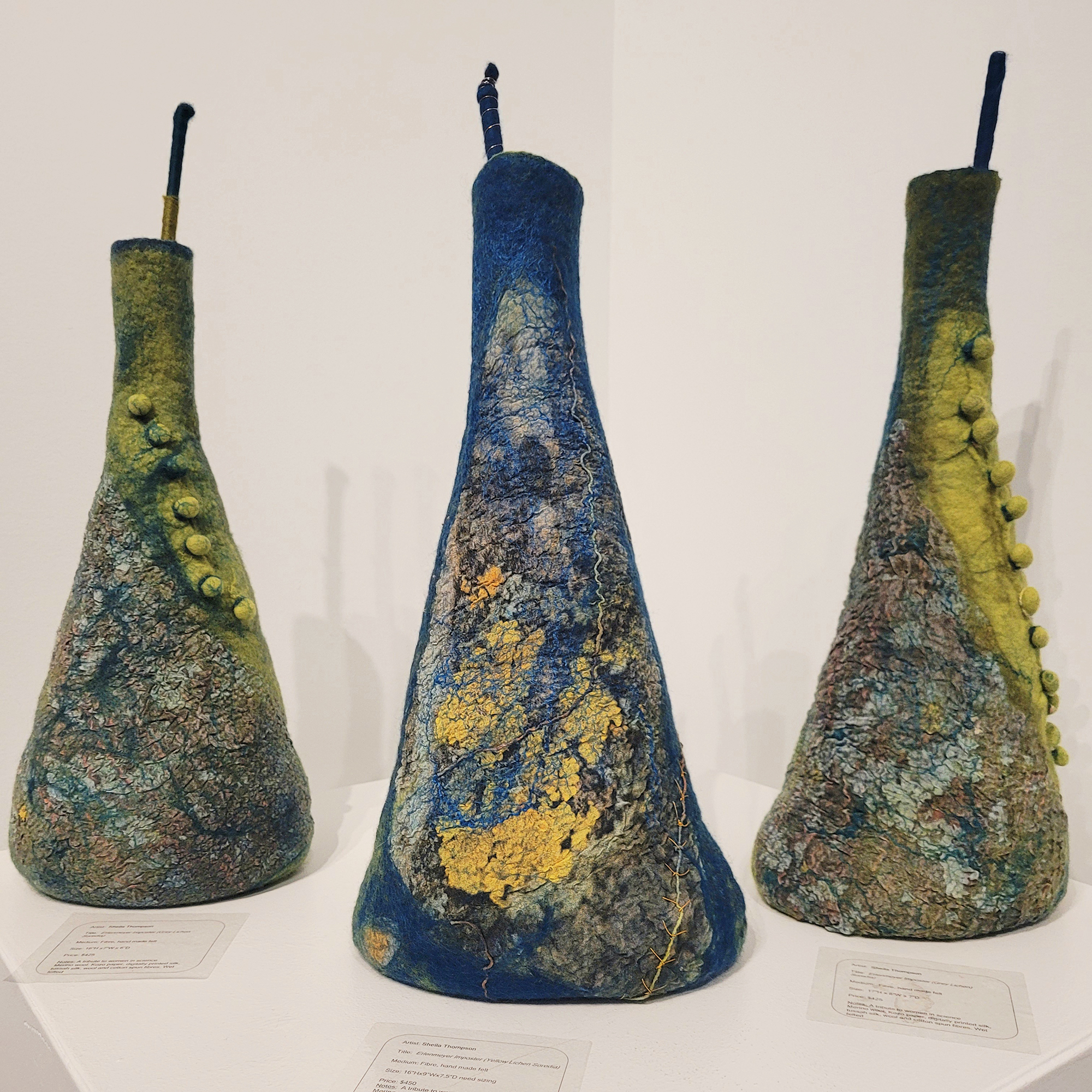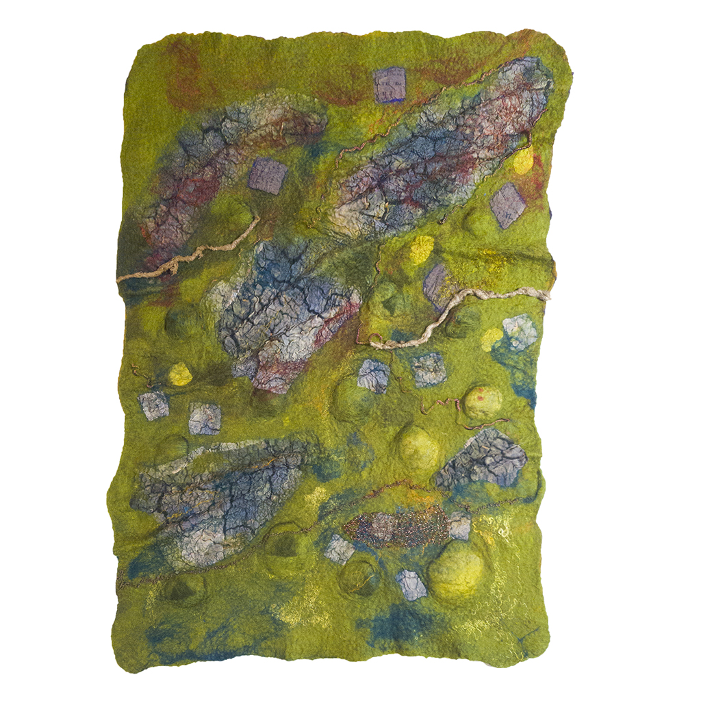 Sheila Thompson recently relocated her narrative-based fibre art practice from Toronto to Guelph. She applies the transformative process of wet felting to wool, Kozo paper and silks to create impressionistic landscapes, abstracts and felted lab flasks. Her art practice emerged as a way to reconnect with her education and experience in biogeography, and her work embodies her knowledge of ecological phenomena and her keen eye for detailed patterns in nature. Her style is distinctly geographic, organic, richly coloured and textured with commentary hidden in the craters and folds of the work. She designs silk textiles from her photographs of natural phenomena as well as her own artwork, and incorporates these into her art work as well as other projects.Over the years, she has focused on themes of community harmony and discord, migration, human/environmental clashes, historical remnants, and social justice. Her latest project, Habitat 2050, developed in response to daily news about the mess humans have made of the environment, reimagines the stories in a more harmonious future. The body of work consists of hand-molded 3d topographic felts in wool, Kozo paper and silk, and a series of felt Erlenmeyer flasks embellished with her prints of fungi and other lifeforms (“Imposters”).She has 15 years experience exhibiting her work in juried group and solo art shows in the Leslie Grove Gallery, Miles Nadal Jewish Community Centre, Gallery 1313, World of Threads and others. She is an active member of ecoart and textile/felt art organizations and has curated a number of small exhibitions. She won an Ontario Arts Council grant to co-curate the travelling textile show, Edge of the Forest and in 2018 was in the BC Craft Council show “Shrine”. Her work is in private collections nationally and internationally.She supports efforts to reduce her carbon footprint by repurposing art, donating materials and by reducing her production output.She also designs textiles from her own photography which she incorporates into her work and into selected artwear and yardage.