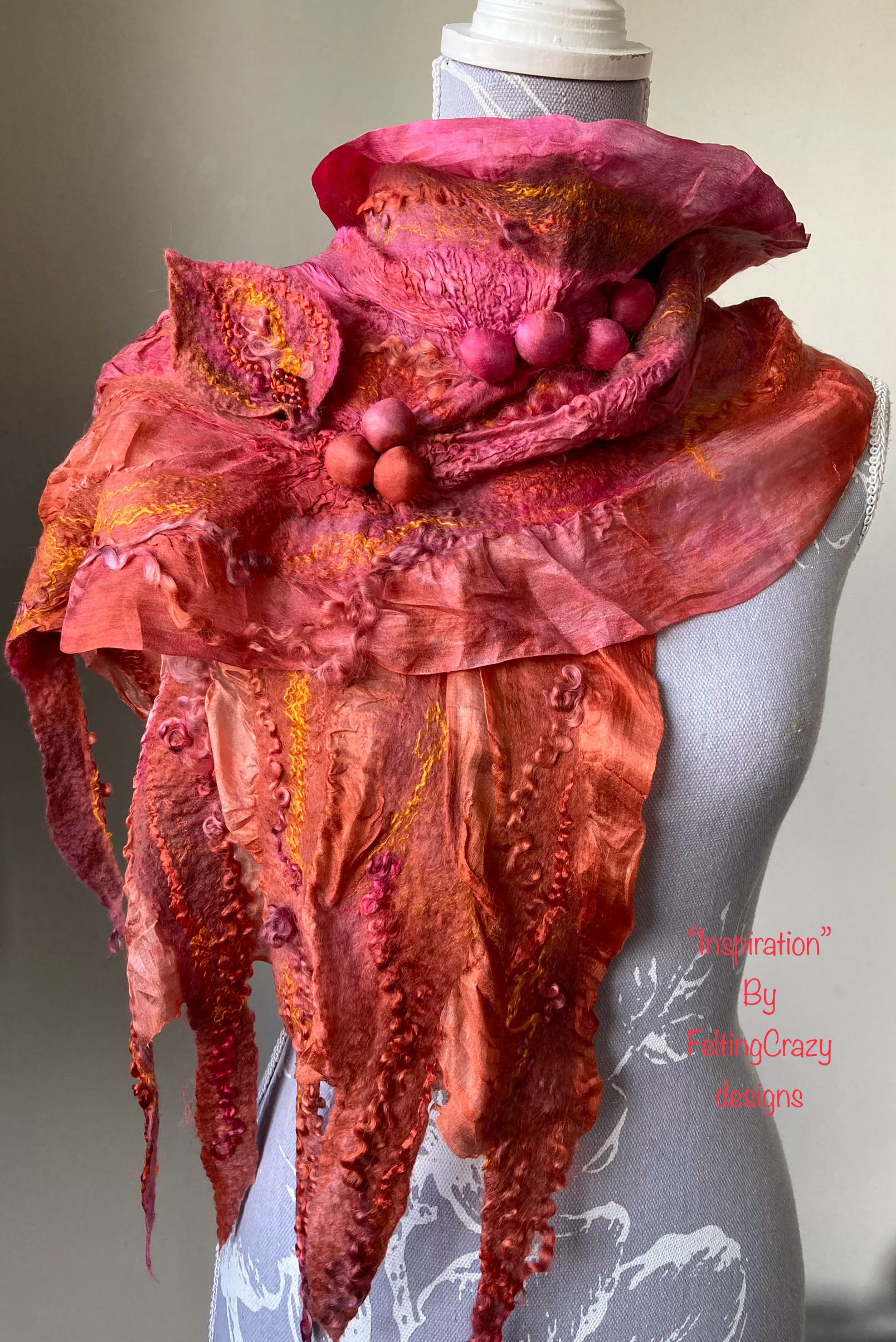 I have been fascinated by textiles all my life but I caught the felting bug about 25 years ago following a 2 hour taster workshop. I now have my own business FeltingCrazy, I create, teach and sell my handmade pieces.