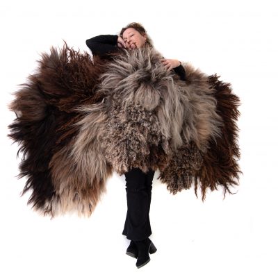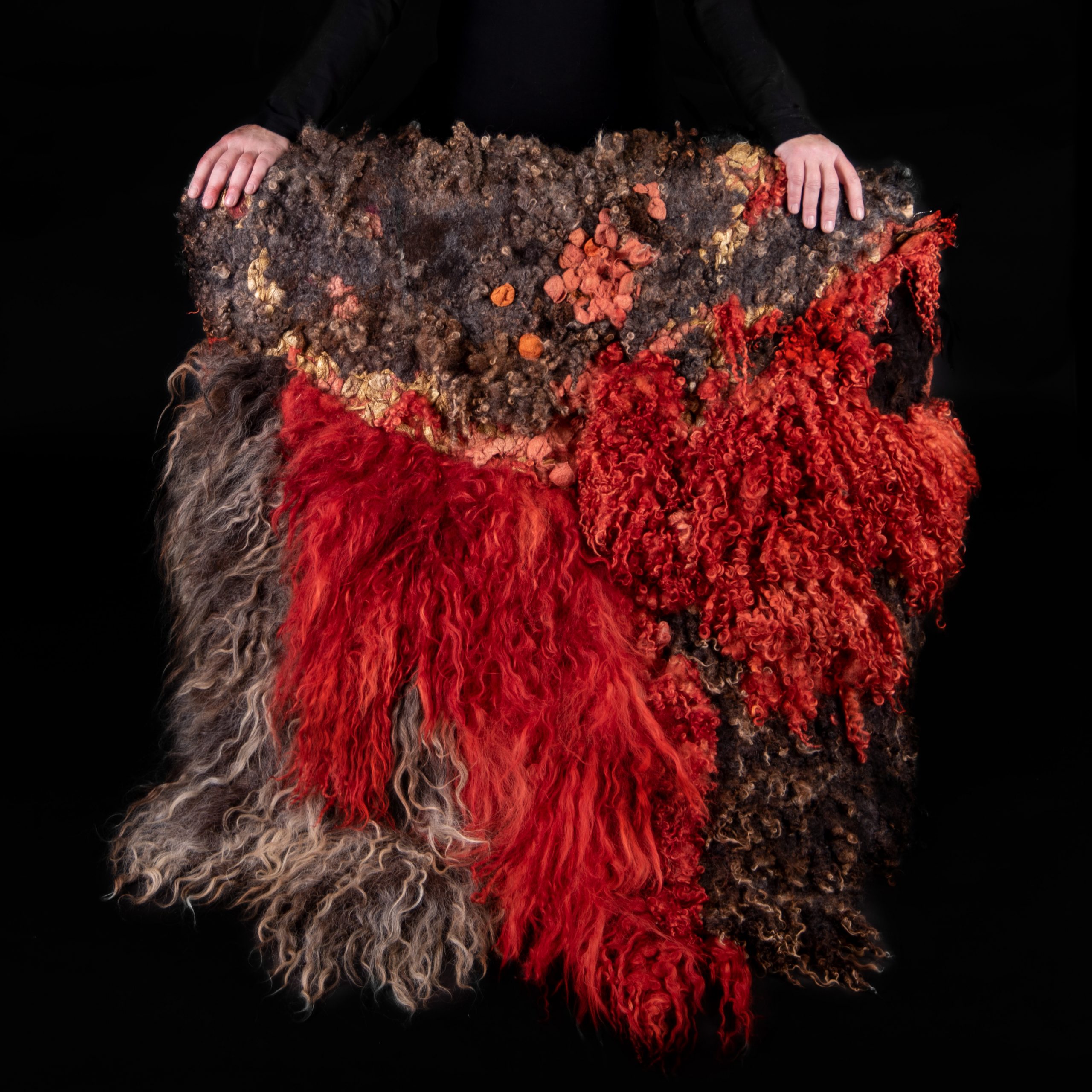 My ‘feltscapes’ are ‘a collage’ of different breeds made from local raw fleeces. The colours I use in these pieces are naturally dyed with foraged plants or flowers from my dye garden.