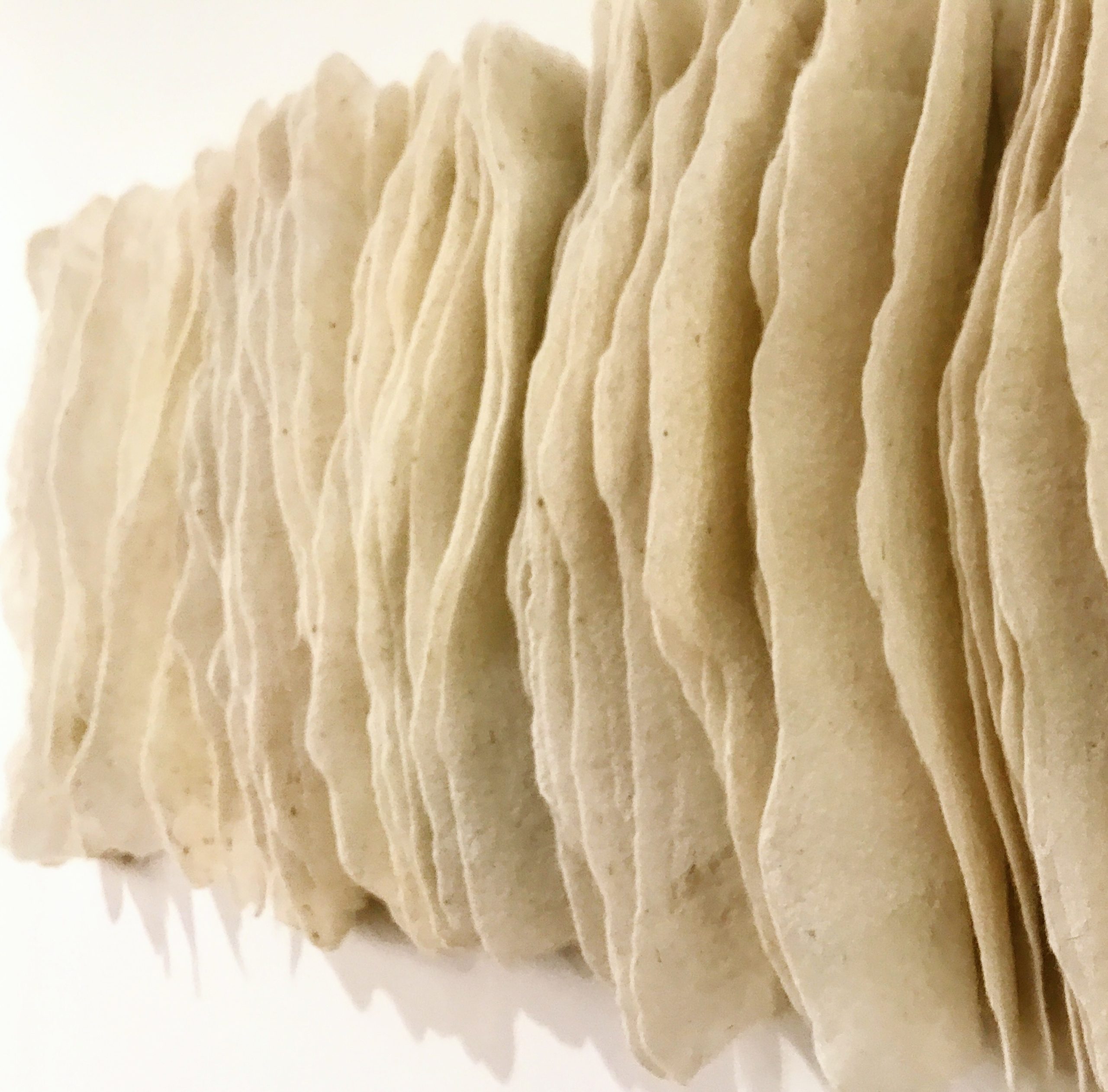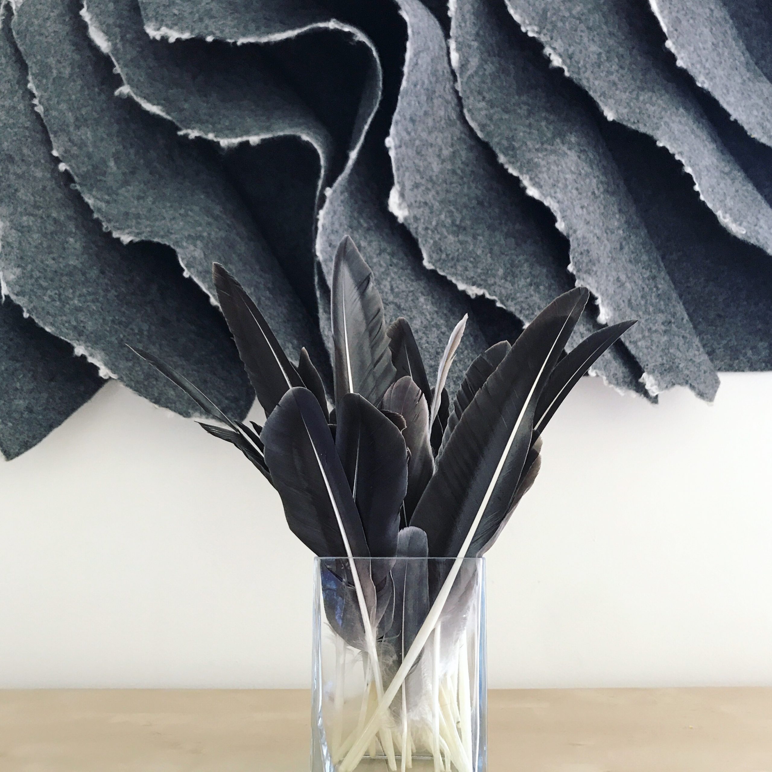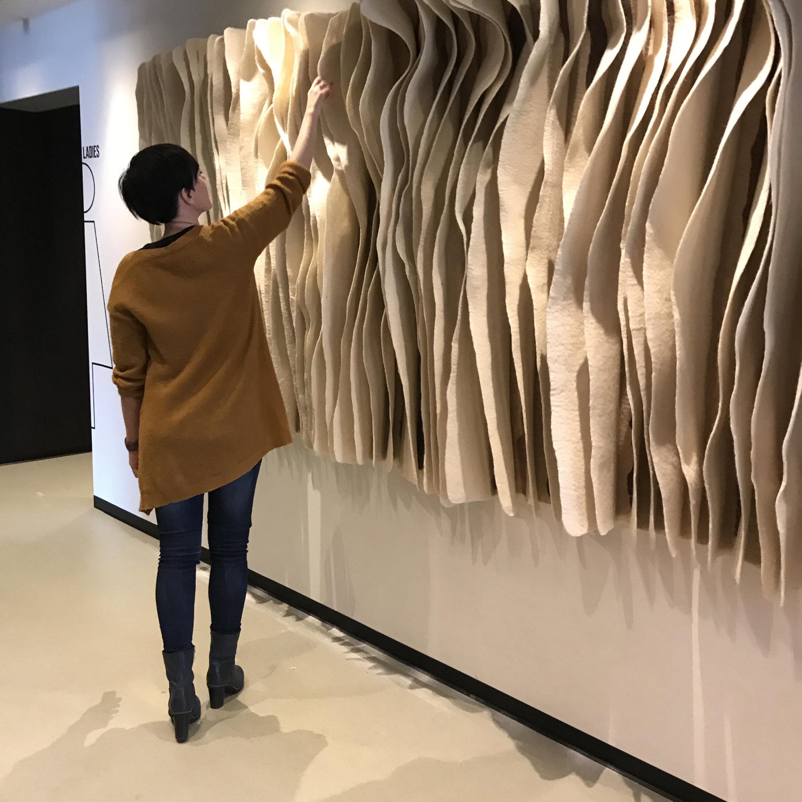 My ‘lamellae’ wall hangings have a more graphic design and are hand felted with European wool. These large pieces are very effective for improving acoustics.