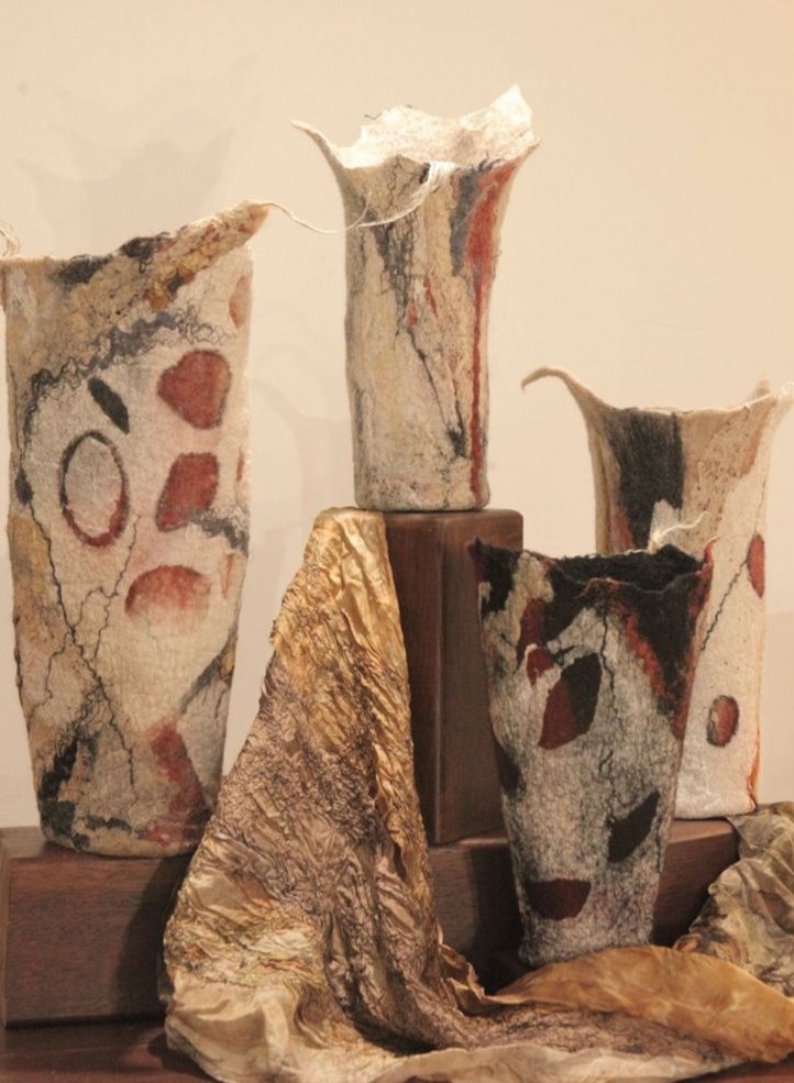 I am a full-time, Australian-based, contemporary felt artisan, textile designer, and tutor. I have been felt making for 30 years and run a vibrant and creative textile art studio from my purpose-built home studio in the Samford Valley in Brisbane, Queensland. I teach online workshops and also in person within organisations and businesses as well as working on commissions and refining my personal felt making practice. I love the experimental and playful properties of felt and its wide-ranging practical and aesthetic applications. My main love is experimental surface texture and design incorporating different fabrics and fibres to make an interesting whole.