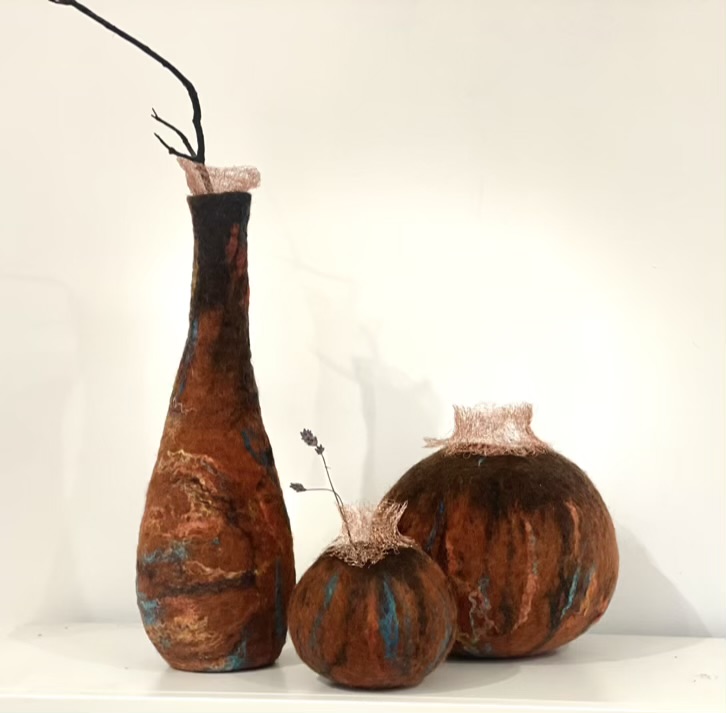 I live on a small holding in Fife, Scotland with my husband, mini Shetlands, pigs and chickens. We had sheep originally and discovered the art of felting when I wanted to find a meaningful way of using their fleece. We no longer have the sheep but my love of felting has remained. I predominantly make and sell felted fleece rugs, but also vessels and baskets along with the occasional felt painting. I teach workshops from my home studio, at a local art centre and at a sheep farm in Perth. I try to use raw fleece sources locally as much as possible to raise awareness of the value of sheep’s fleece!