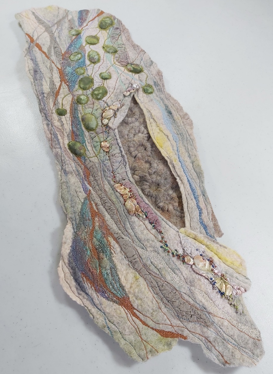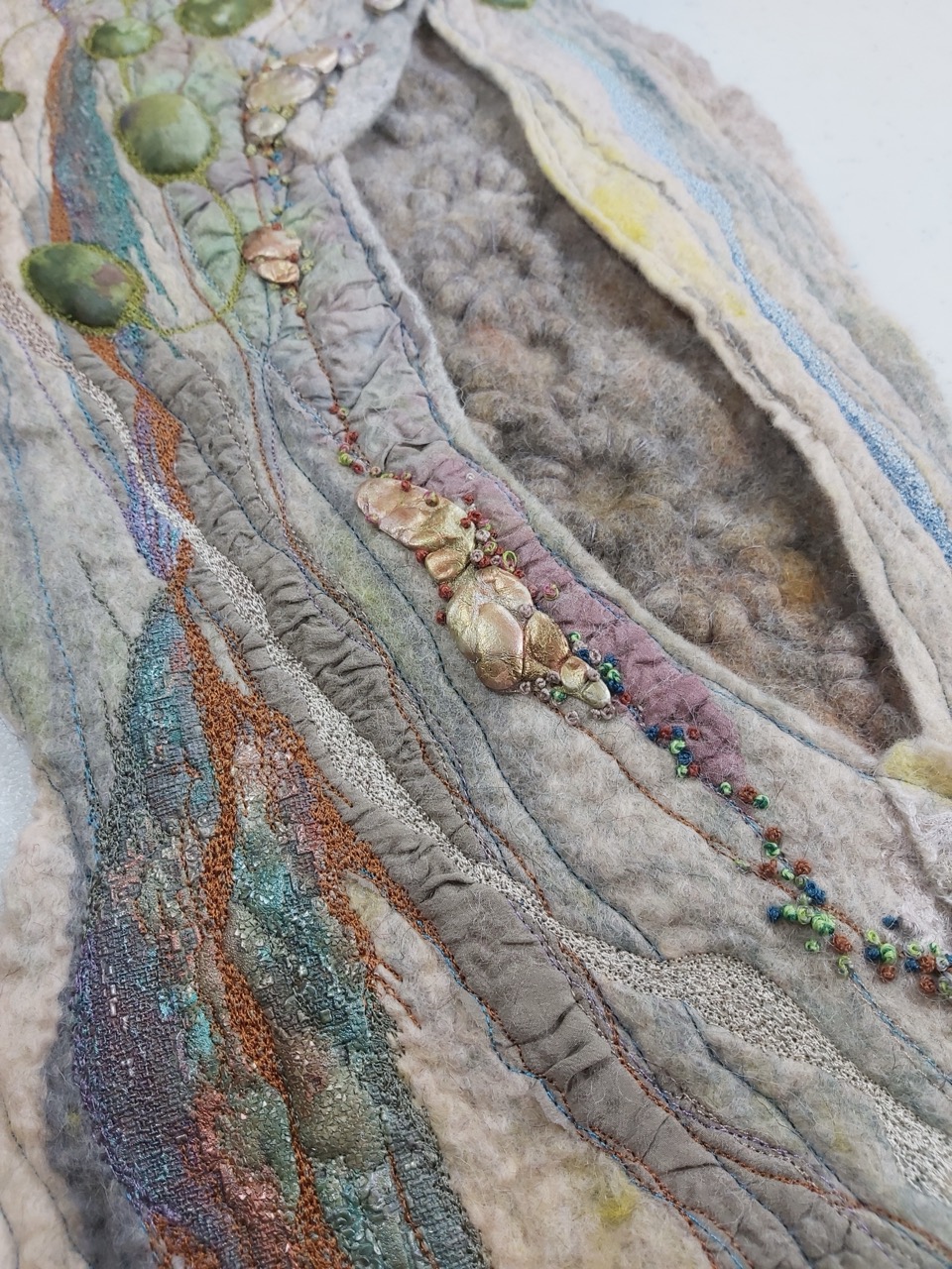 Materials and Techniques: Materials include Corriedale and Bergschaf fibres, silk fabrics, wallpaper, Tyvek paper and embroidery threads. Techniques used include wet felting, Nuno felting, painting, hand and machine embroidery.