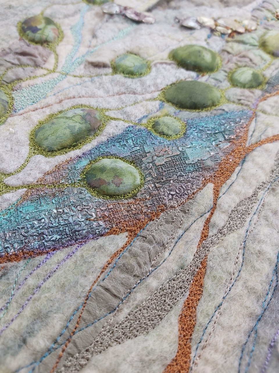 Inspiration: The Passage of Time was inspired by the beautiful markings in the sandstone slabs that can be seen on the beach at Seahouses in Northumberland. Corriedale and Bergschaf fibres have been wet felted to create the base slab which was then embellished with machine and hand embroidery. The cut out reveals a layer of fossils beneath.