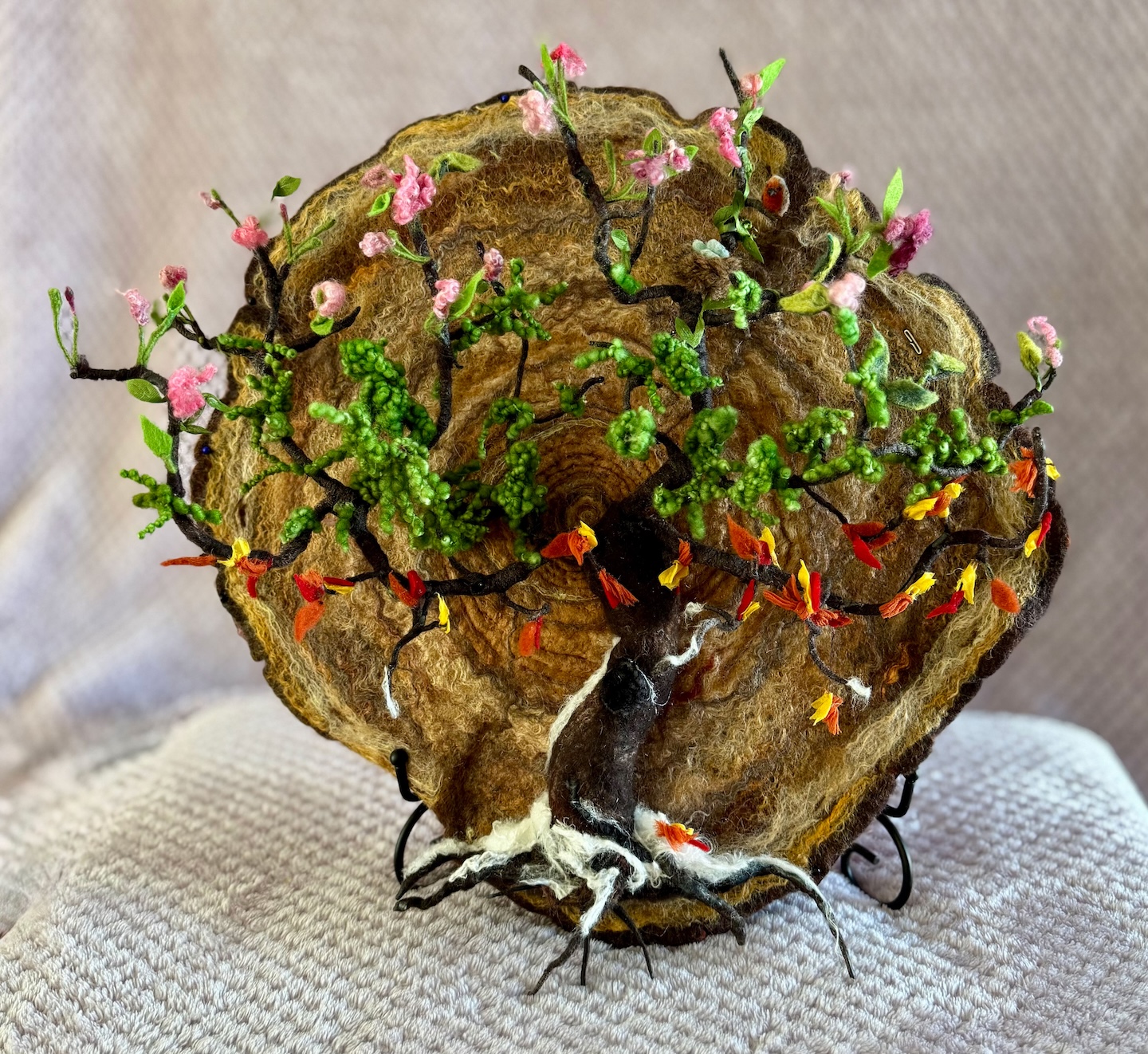 Inspiration: This tree changing seasons, mounted on a background of the tree’s internal rings, is a metaphor for “time,” illustrating its linear progression and cyclical nature. The changing seasons are an external symbol of time passing, the rings indicate internal growth, offering a natural diary of life, resilience, and history.