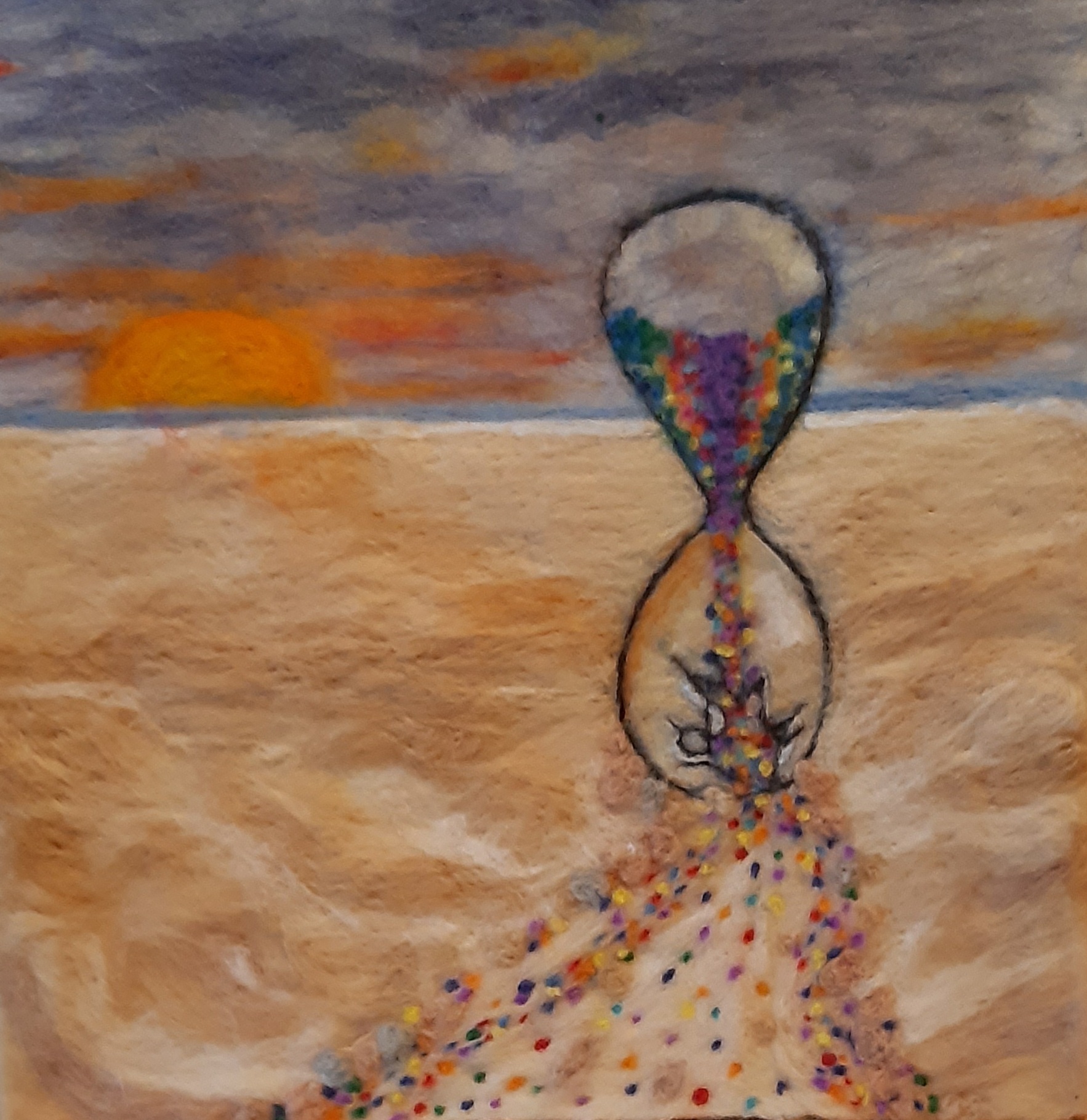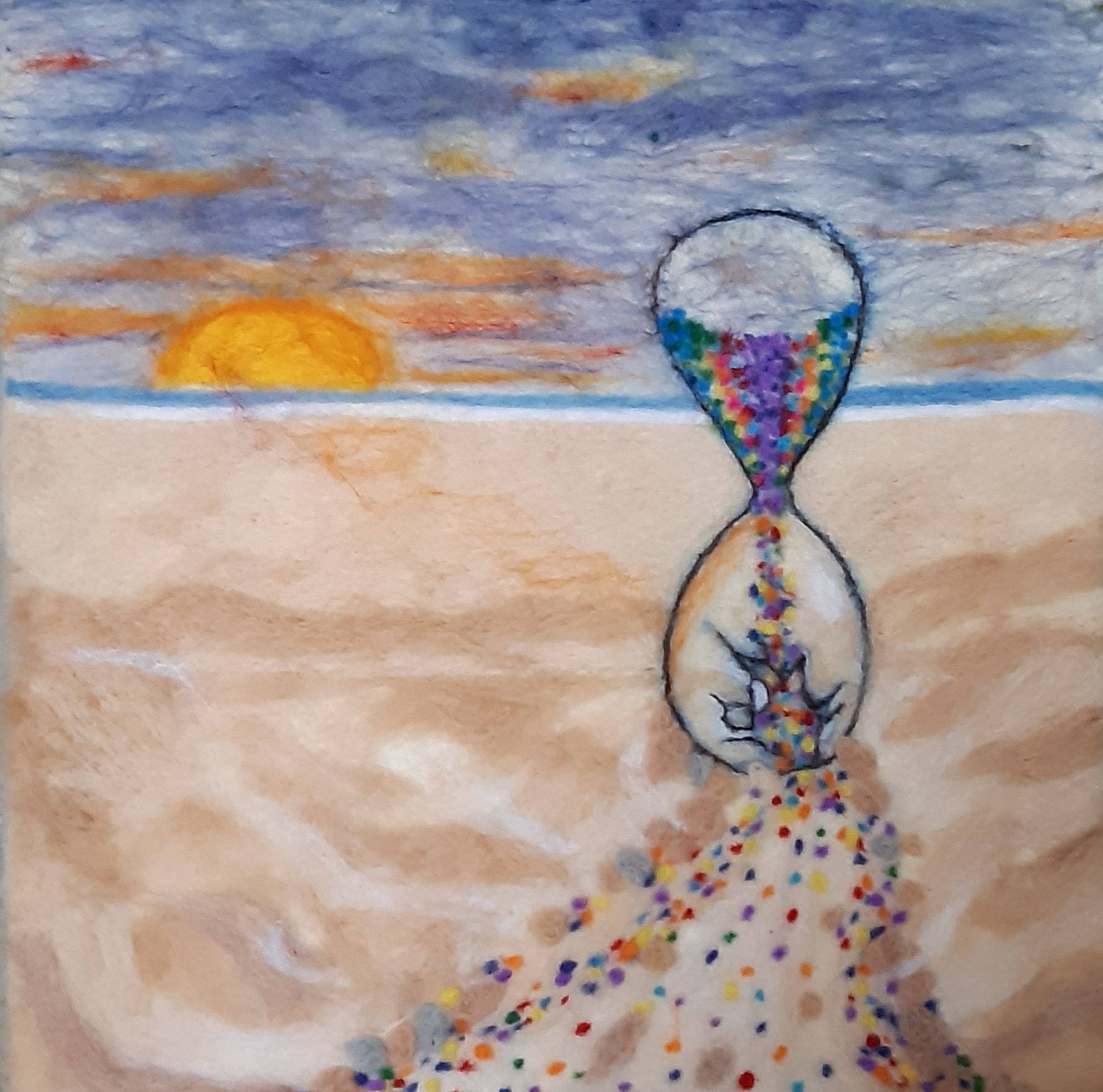 Inspiration: Time is fleeting and precious . It can be easily wasted , fly and slip away . Represented by the coloured sand escaping from a broken hourglass on the dunes of a beach at the end of the day