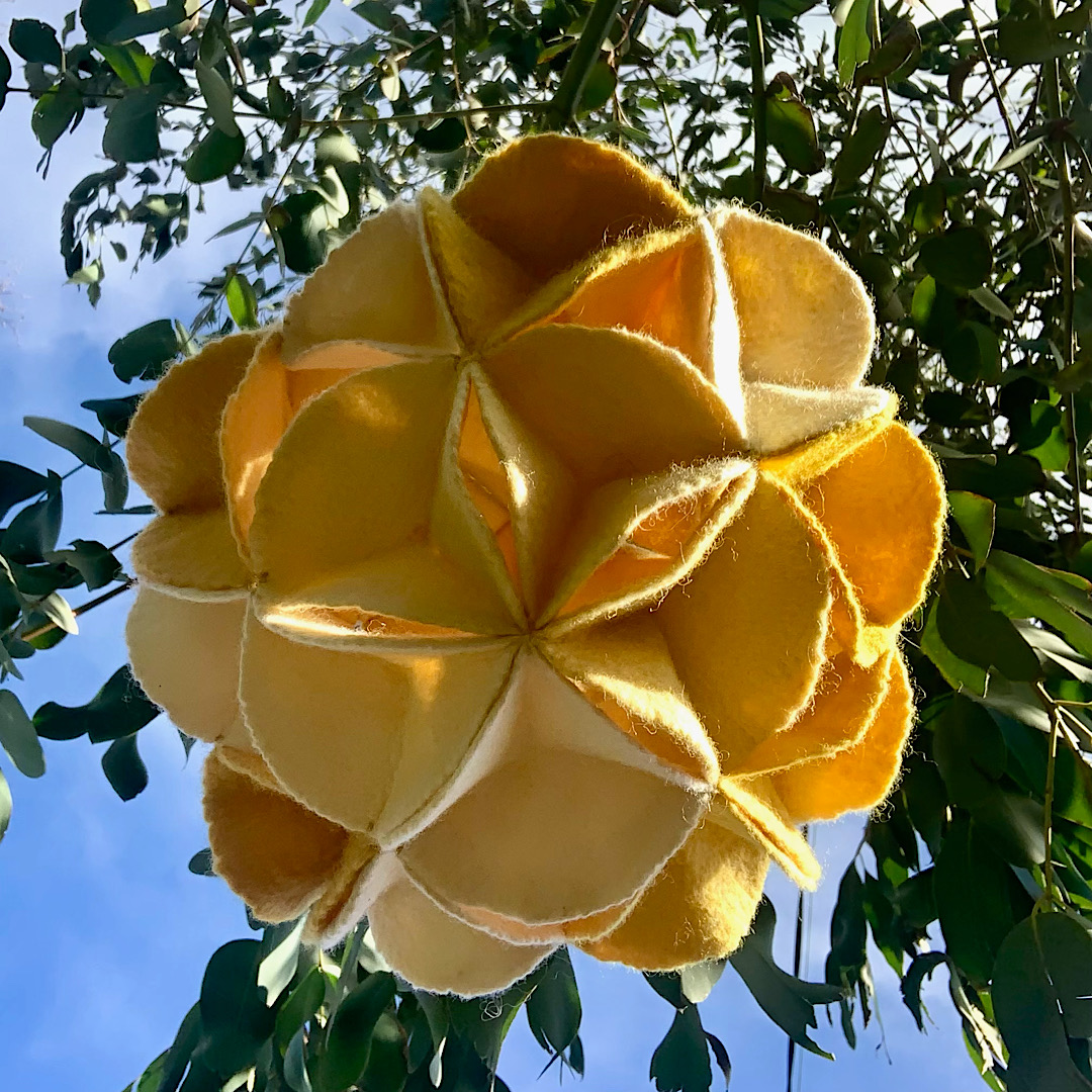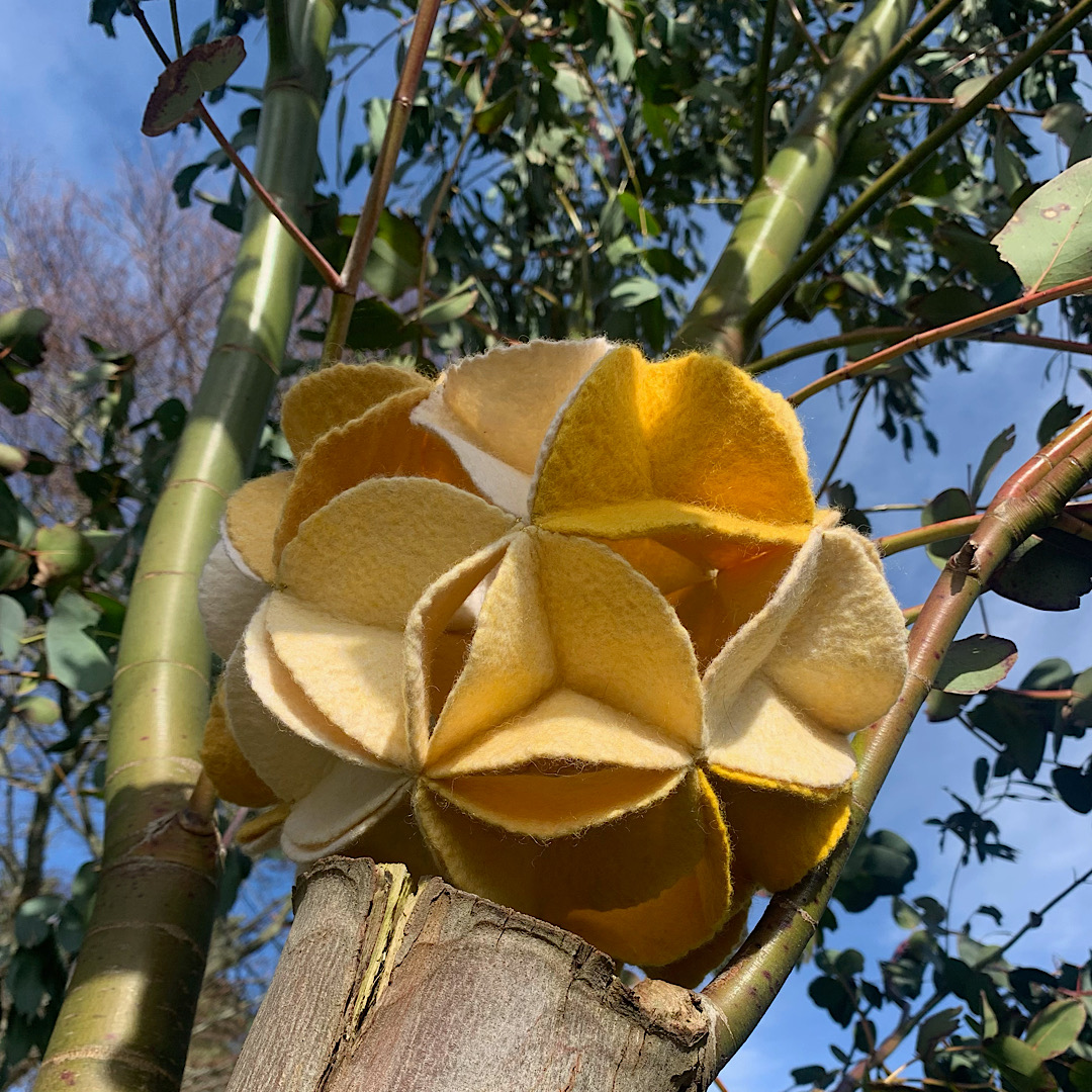 Inspiration: Early 2026 was grey with no sunshine! I was keen to felt regularly and use bright yellows in anticipation of the arrival of Springtime. Time, as a construct, made me think about the earth cycles, plant structures and the orb shape slowly emerged from my process.