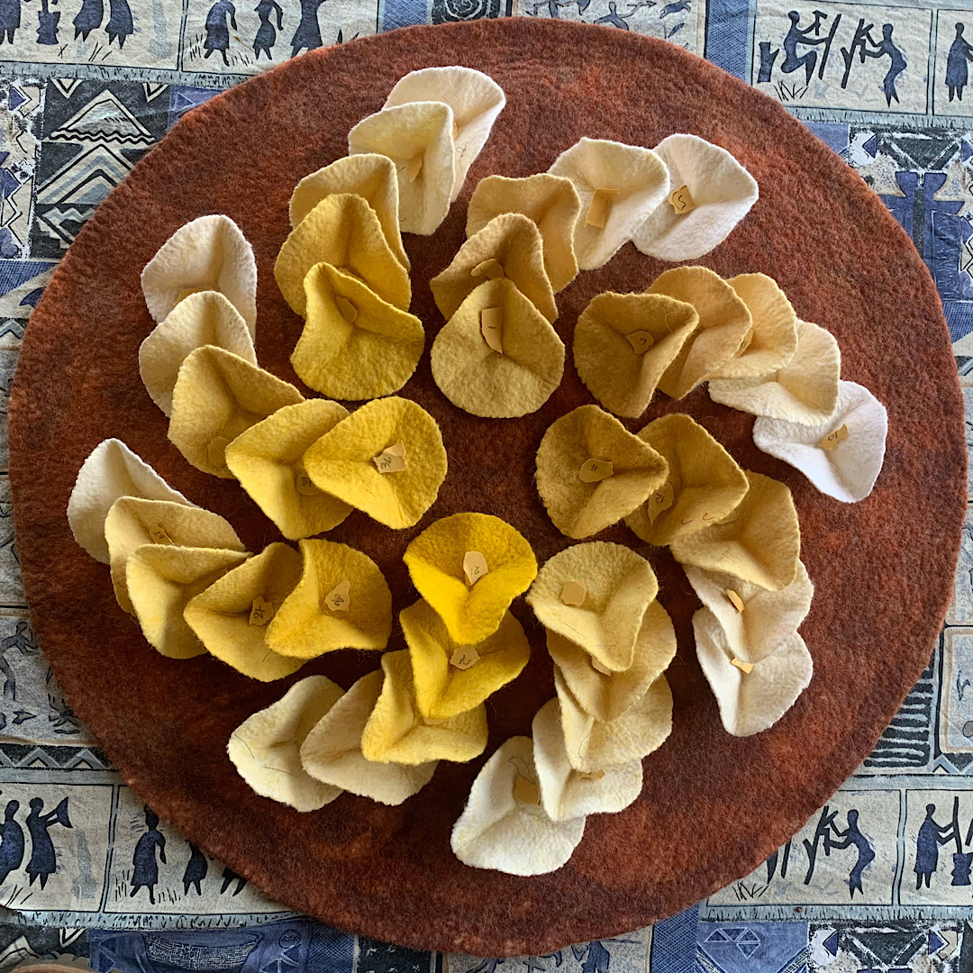 Materials and Techniques: 1 merino lightning, 1 merino buttercup, 1 blue faced Leicester corn yellow and Extra bleached tussah silk An exercise in blending wool and precision to obtain different hues of yellow in order to create 40 discs. All 10cm in diameter and 4.5 grams