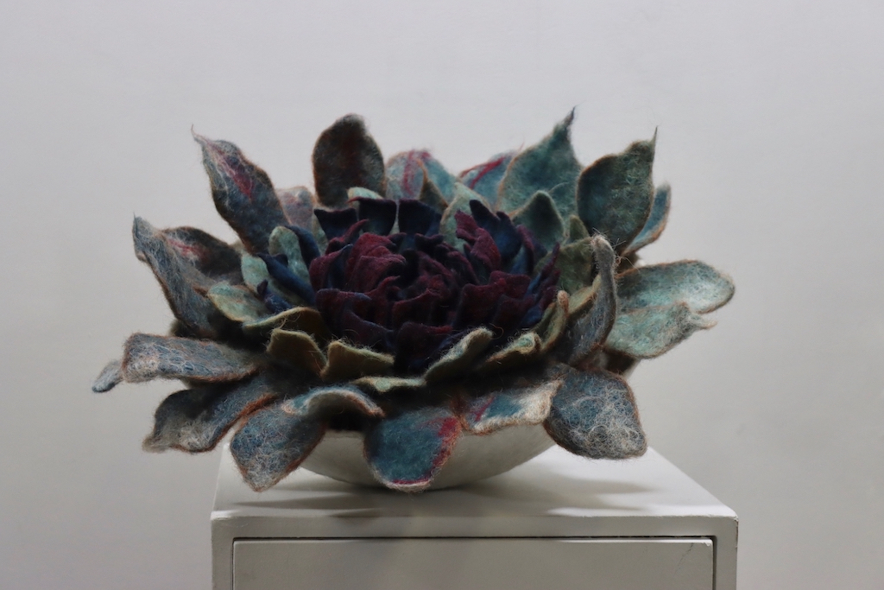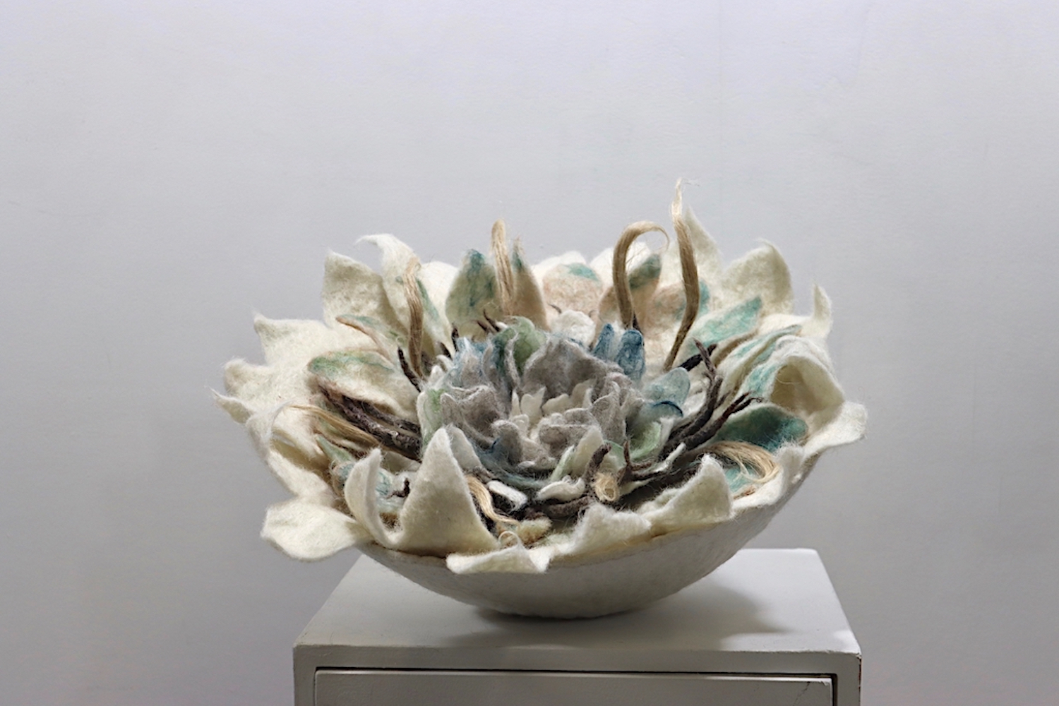 Materials and Techniques: Cotswold wool, Merino and Kuzo Paper or steel wire to mount. Technique: wet felting, needle felting, stitching and nuno felting or chaotic wire weaving for mount.