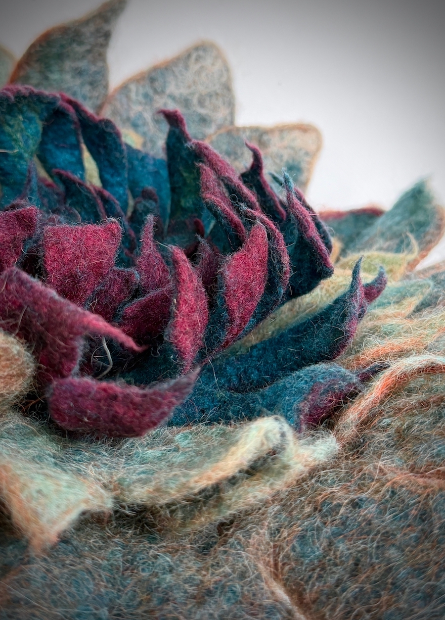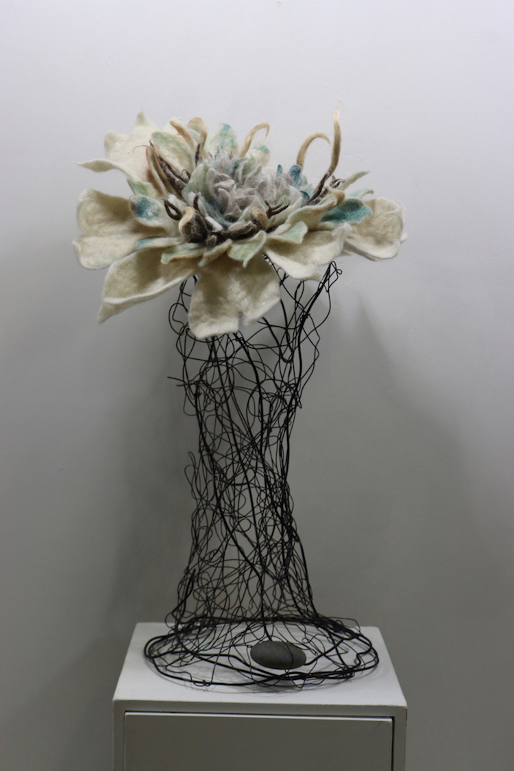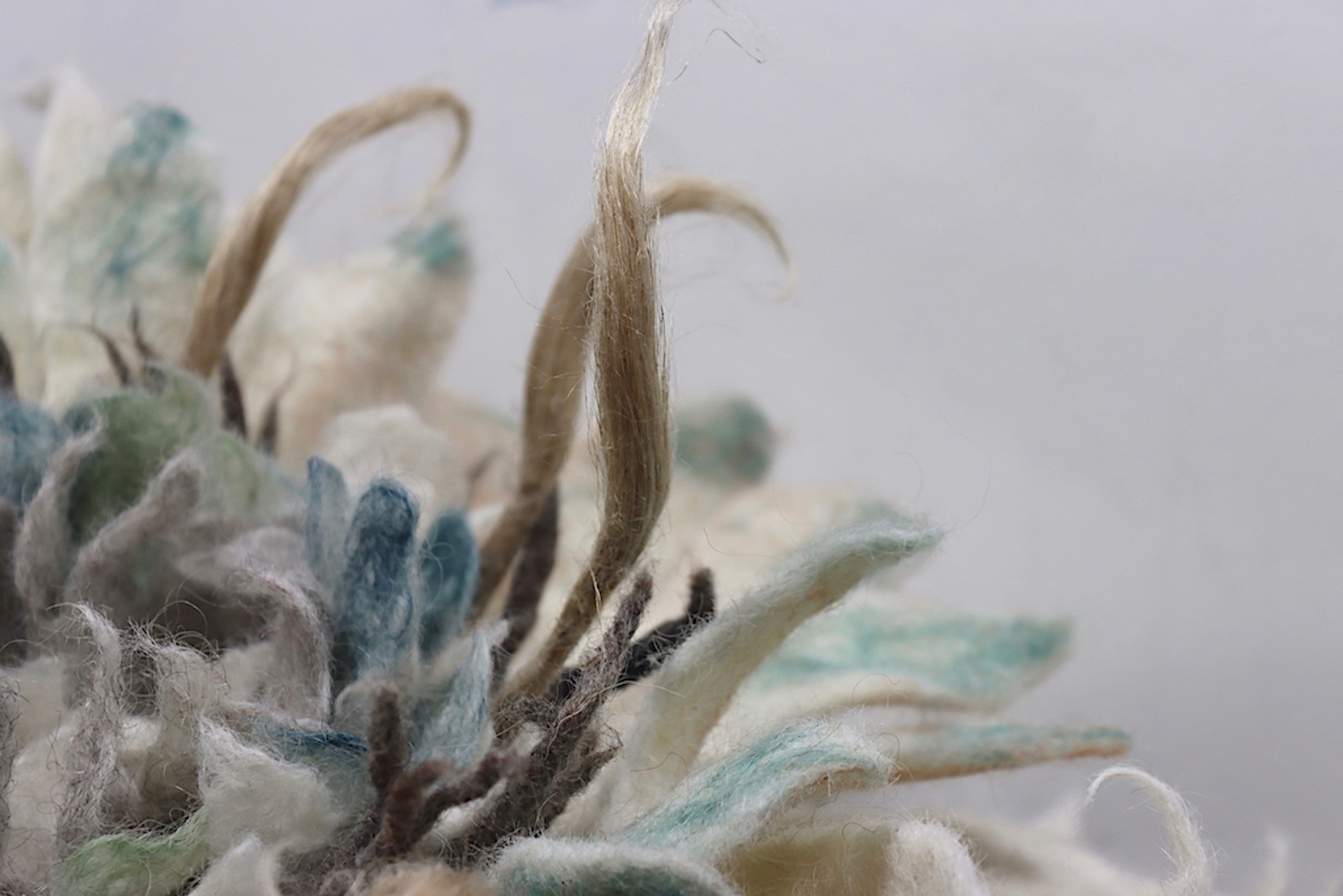 Materials and Techniques: Cotswold wool, Merino, Flax and Kuzo Paper or steel wire to mount. Technique: wet felting, needle felting, stitching and nuno felting or chaotic wire weaving for mount.
