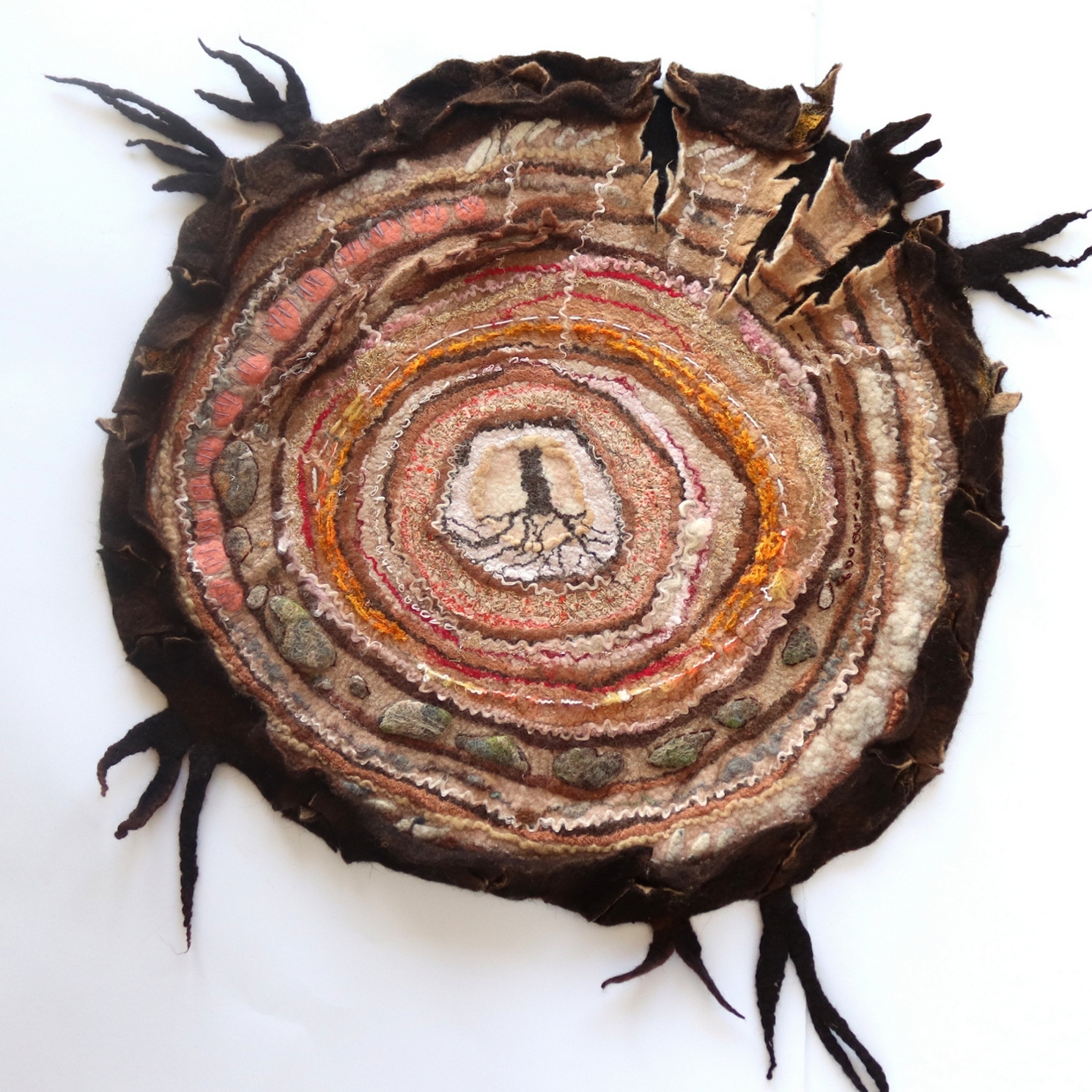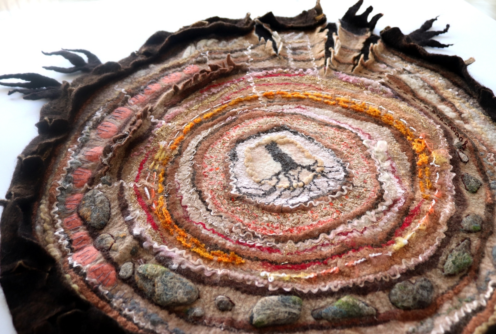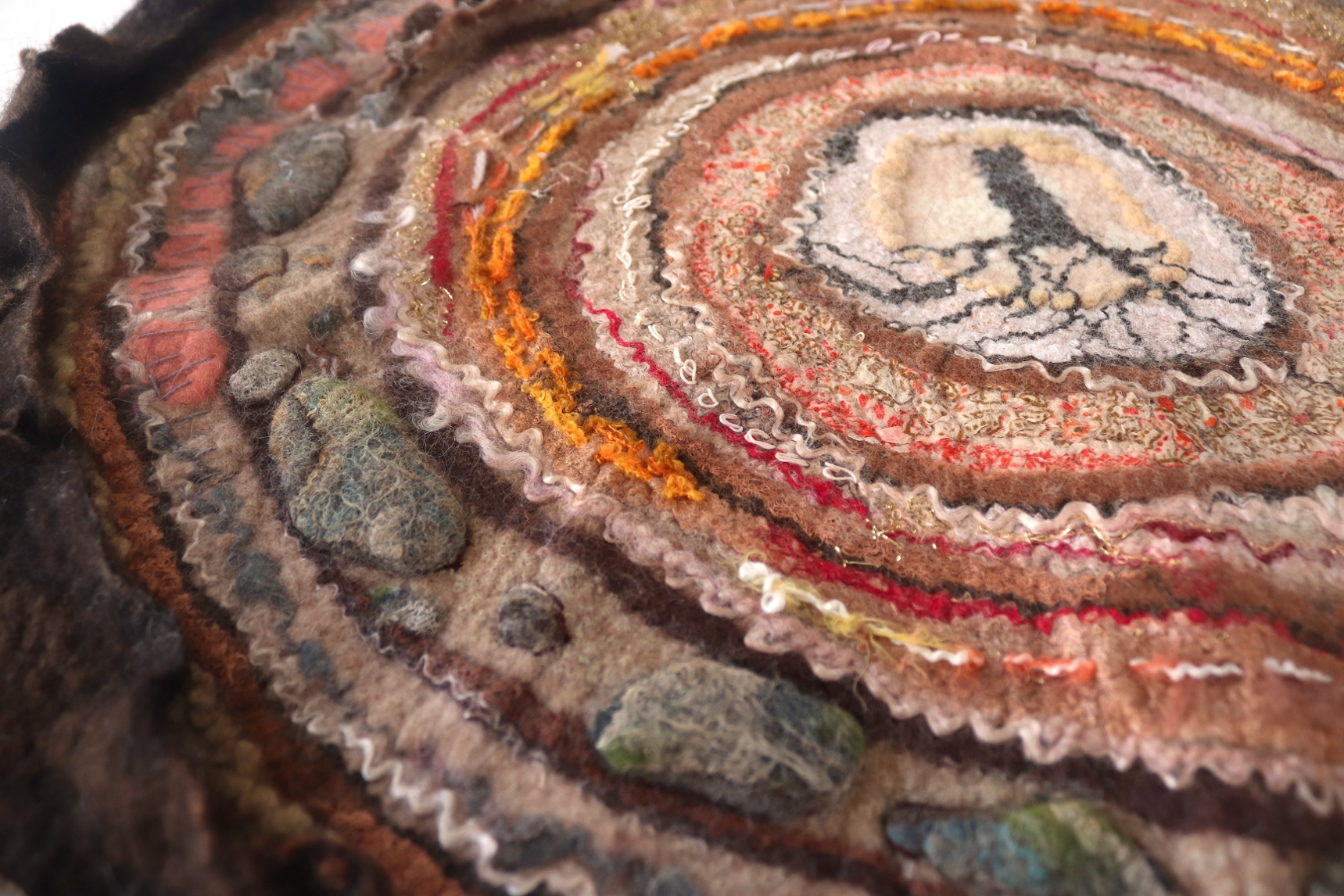 Materials and Techniques: merino wool, fancy yarn, silk fabric, fibers, wet felting, diameter 70cm