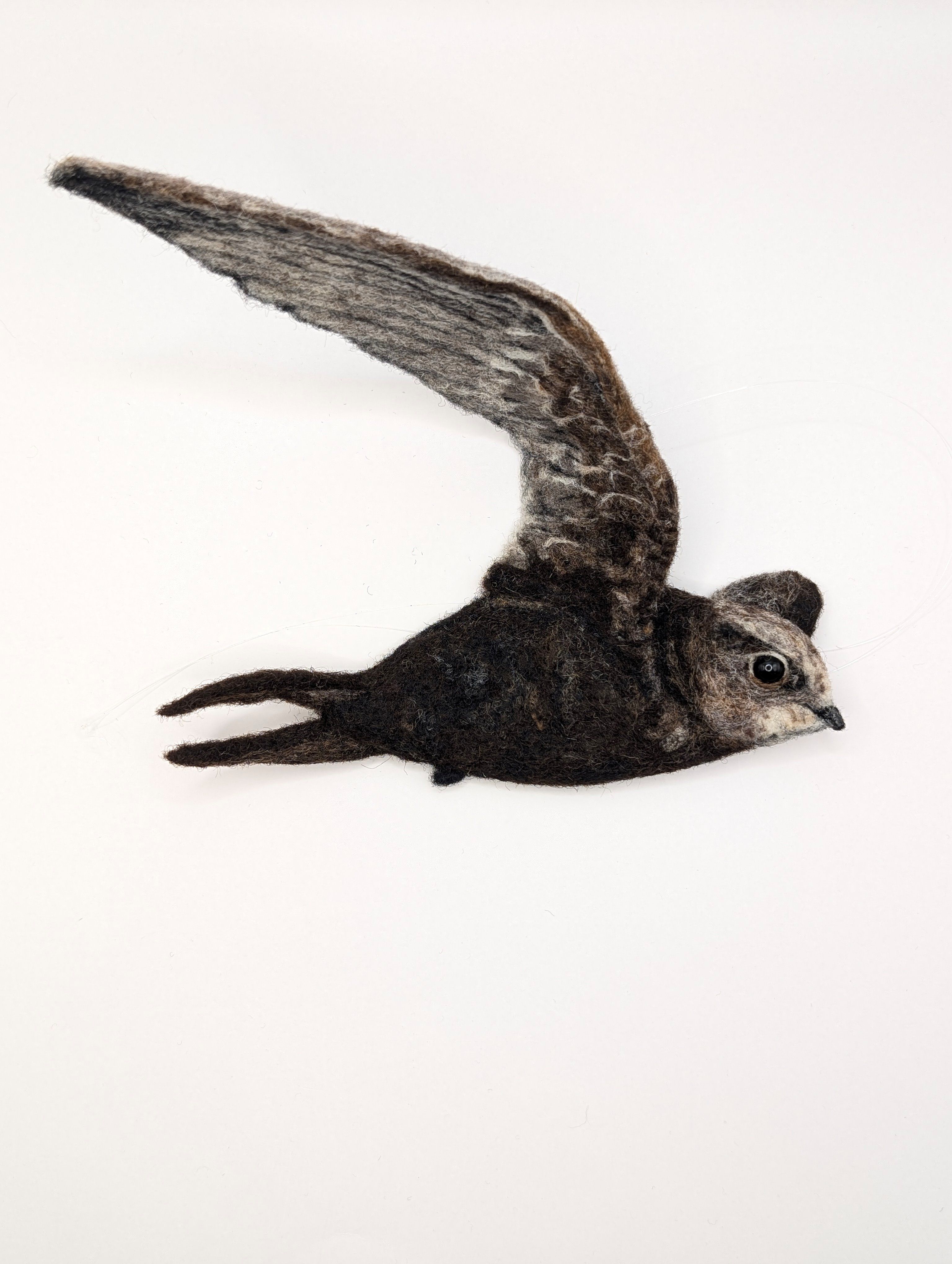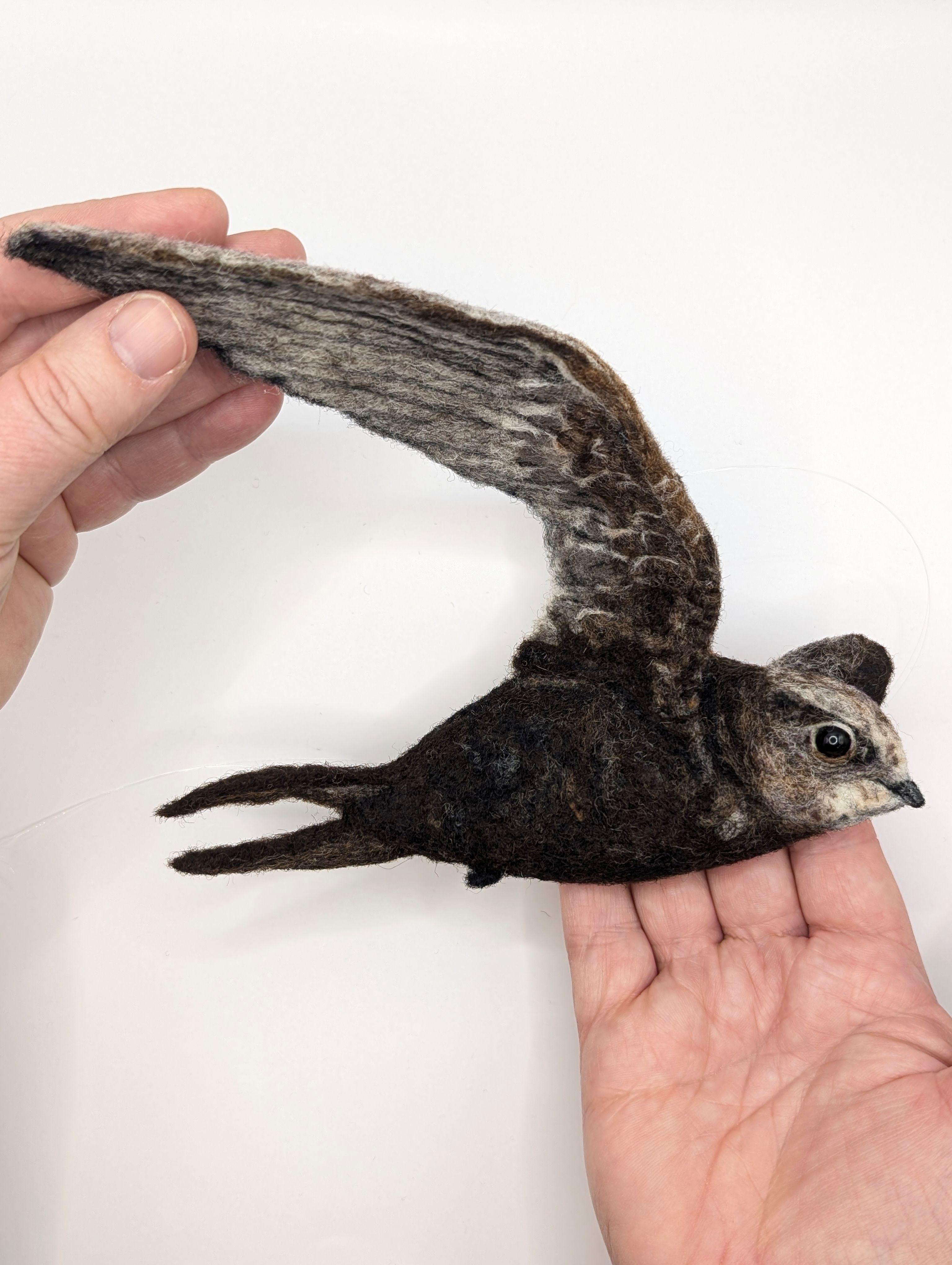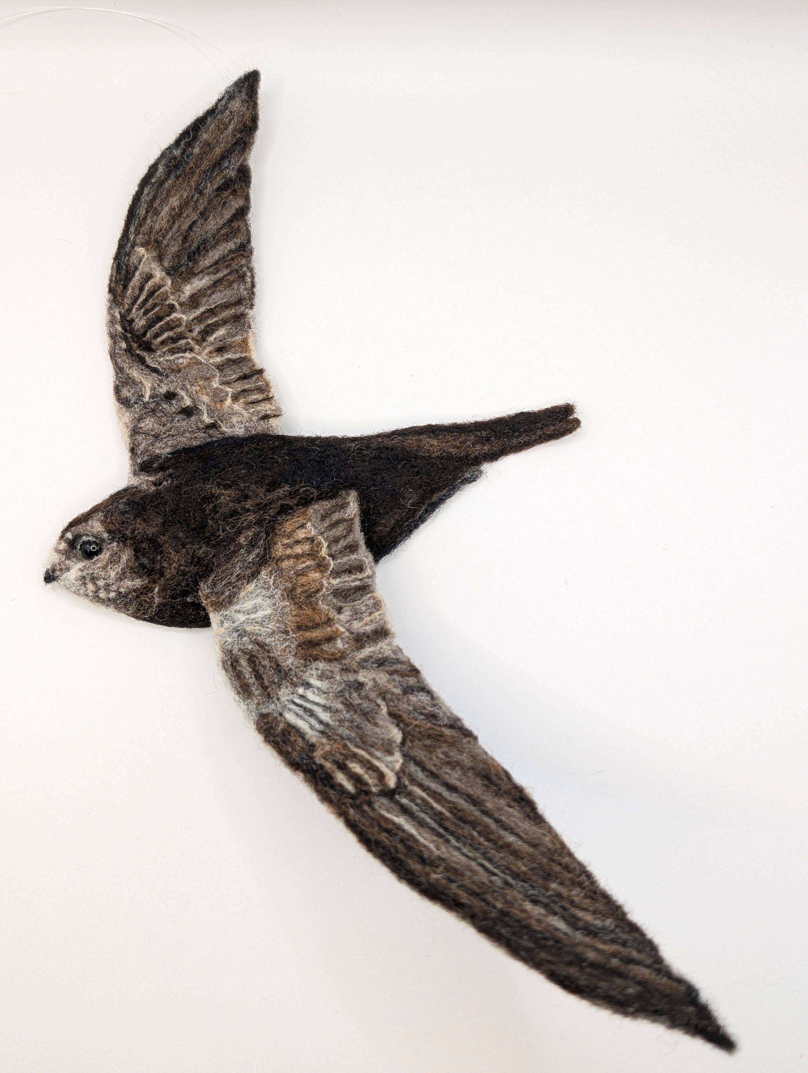 Inspiration: Swifts mark the movement of time when migrating to the skies above my home, bringing summer with their screams. Painting the season-turn with their incredible curved, brown and grey feathered, slight and delicate, sickle-shaped wings. This translates perfectly into the lightness of fibre and needle felt.