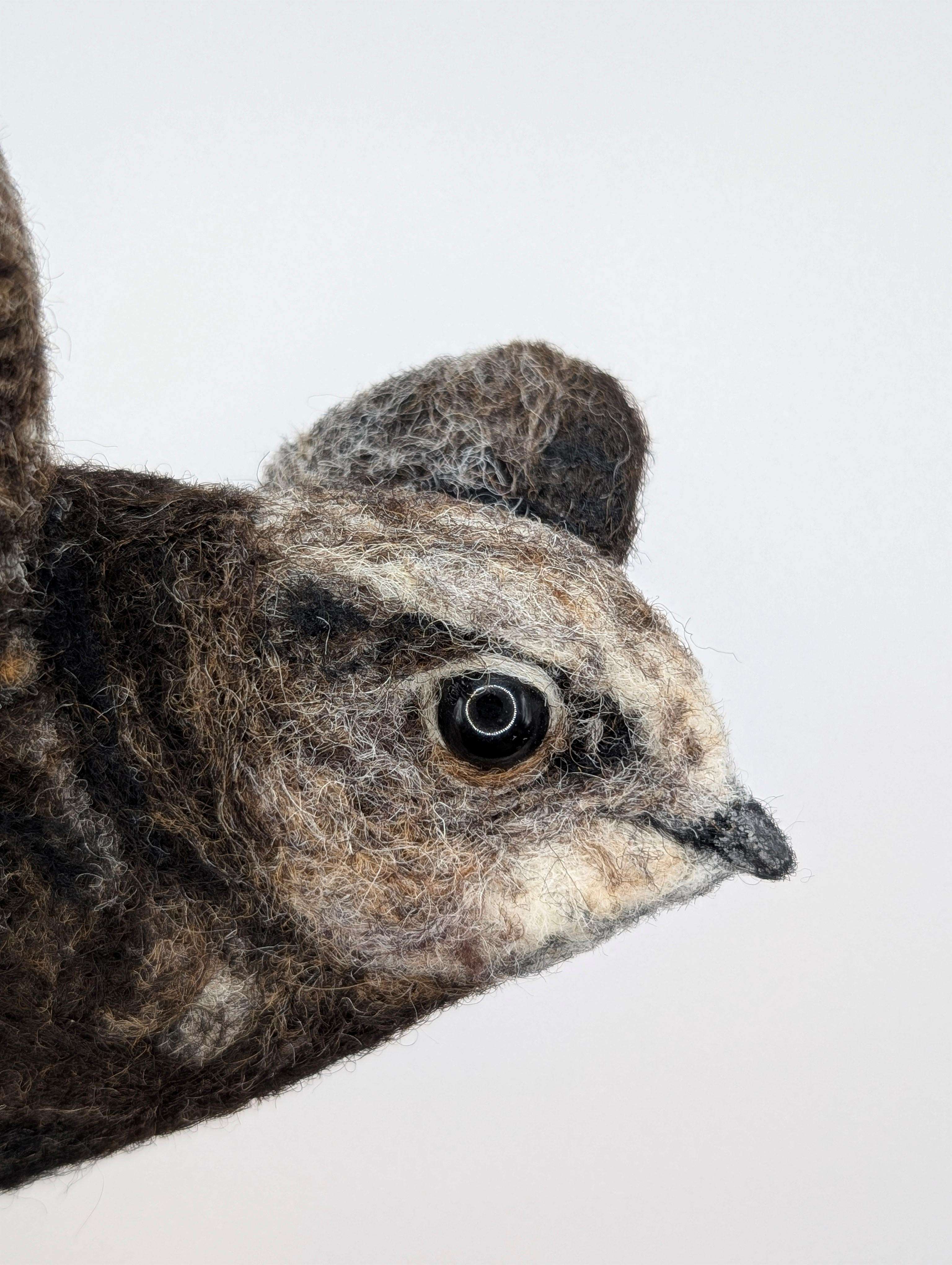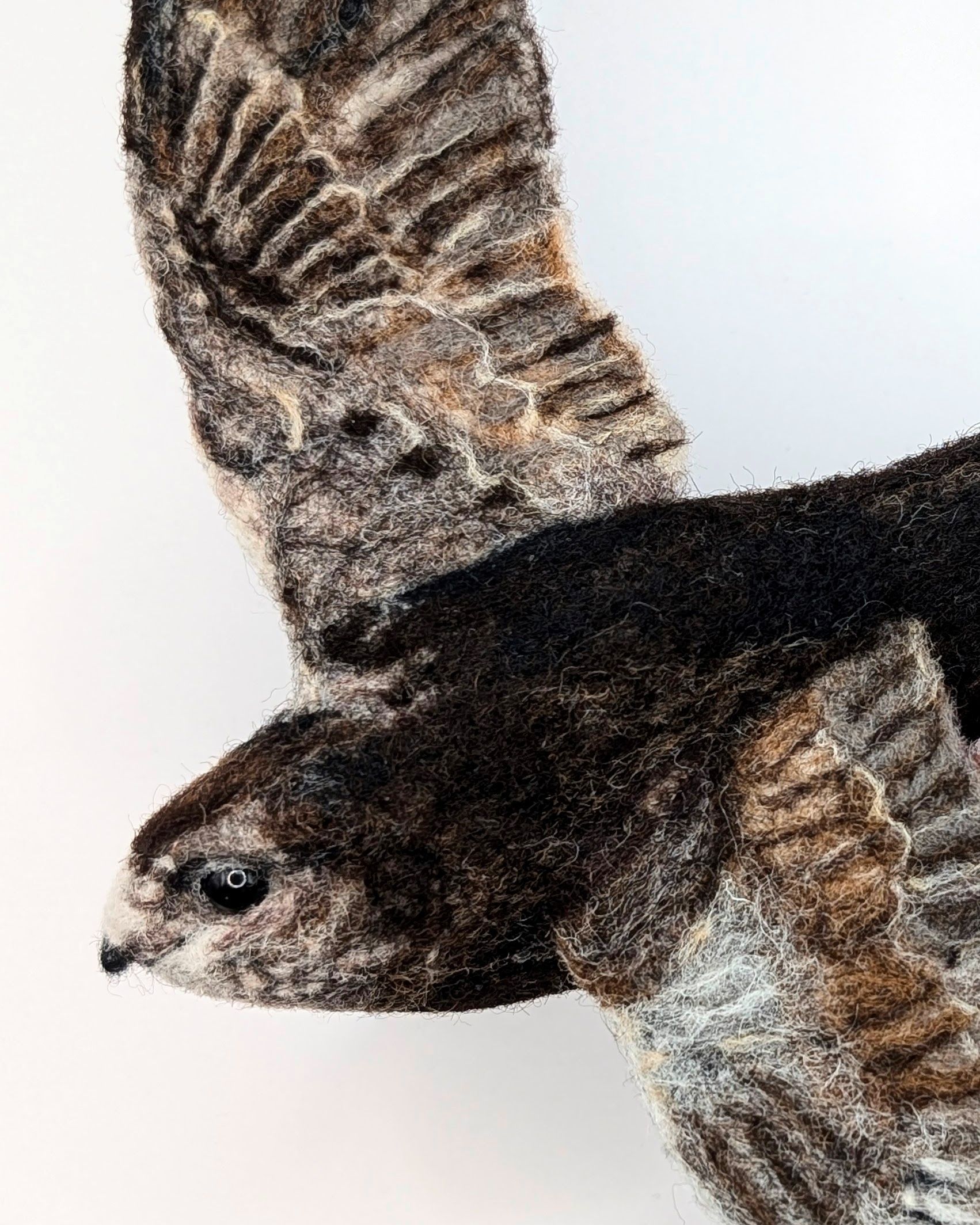 Materials and Techniques: Needlefelt wool with wired wings and hand-painted poured resin eye